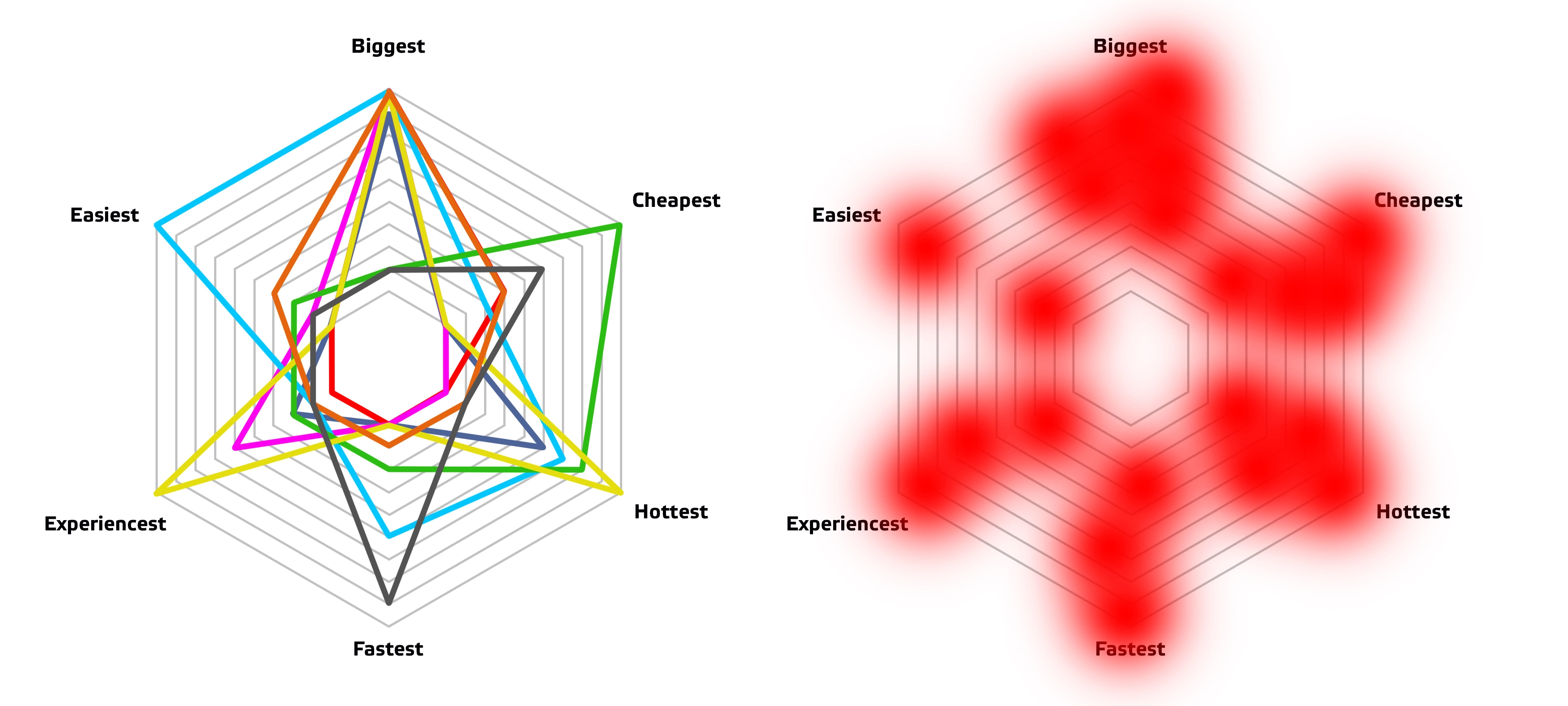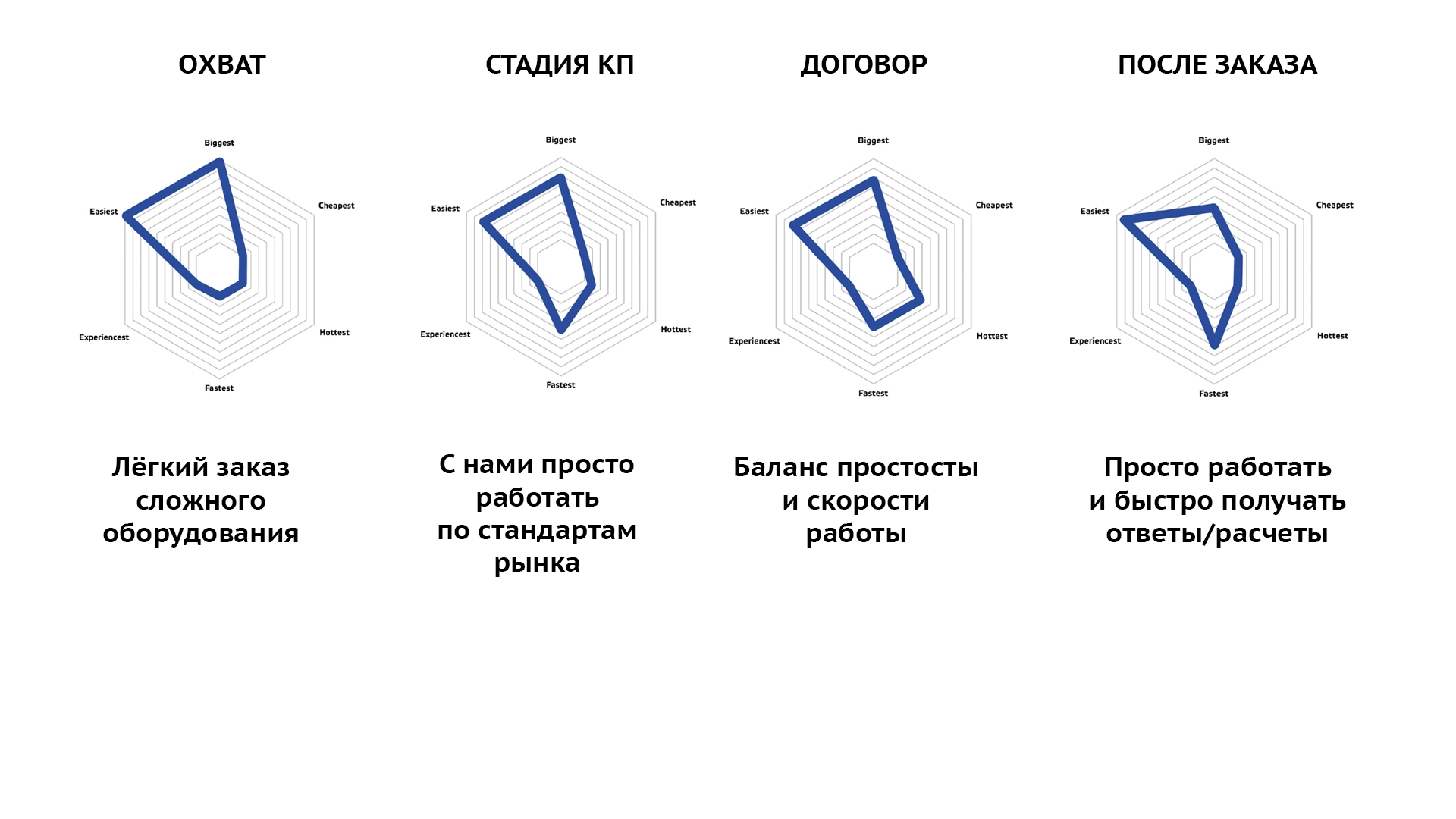 Сопоставив рейтинги, сайты конкурентов и инсайды от отдела продаж, мы увидели общую картину рынка. Почти все конкуренты били в характеристики «самый надежный» или «самый масштабный» (эти зоны были «перегреты»). Но зона Easiest (Простота) была абсолютно свободна.