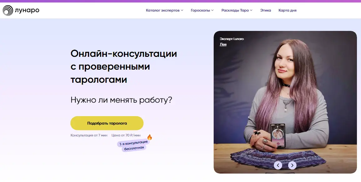 Lunaro объединяет более сорока экспертов: здесь работают астрологи онлайн, тарологи, нумерологи. Новичку дарят семь минут видео, где специалист посмотрит восходящий знак, расскажет о текущем квадранте дирекций и объяснит значение узлов Луны. Демо ставка от 70 ₽ / мин; доступны банковские карты, ЮMoney и Google Pay. Интерфейс показывает аспекты планет в реальном времени, вплоть до точного тригона Юпитера и Венеры.