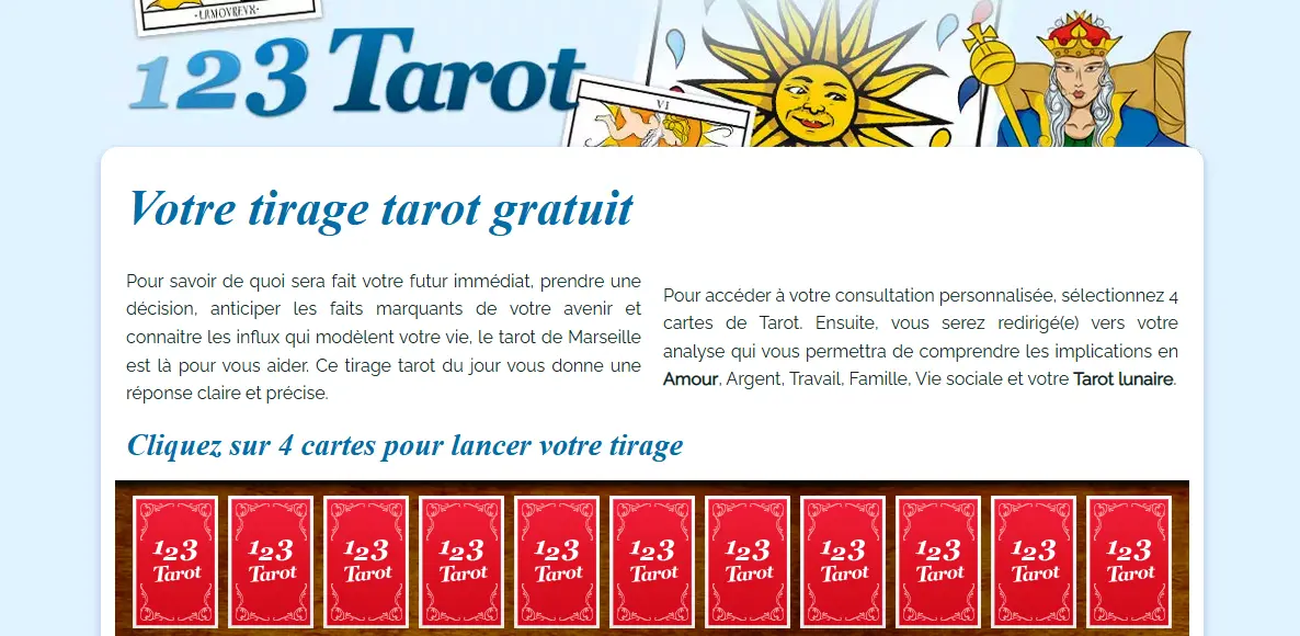 8. 123Tarot — европейский портал экспресс-раскладов и лунных прогнозов