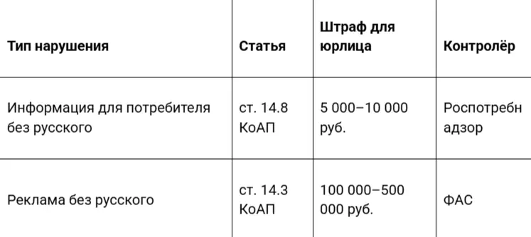 Реклама под действие этой статьи не попадает. Закон прямо использует формулировку «не являющаяся рекламой». Однако рекламные материалы без русского текста могут нарушать статью 20 Федерального закона №38-ФЗ «О рекламе». Контроль в этом случае осуществляет Федеральная антимонопольная служба.