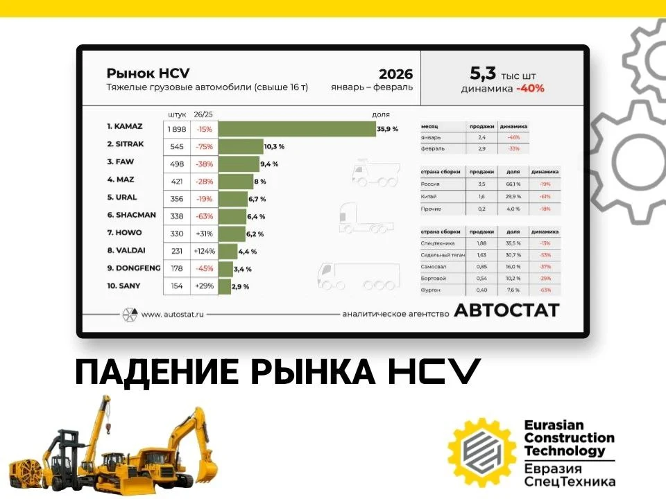 "Автостат" опубликовал статистику продаж тяжелых грузовиков (свыше 16 тонн) в России по итогам января и февраля 2026 года. За два месяца было зафиксировано падение рынка HCV, который сократился на 40% в сравнении с аналогичным периодом 2025 года (до 5 300 автомобилей).