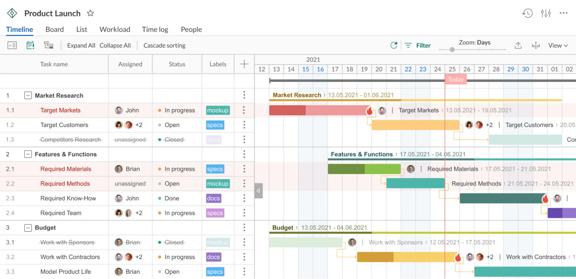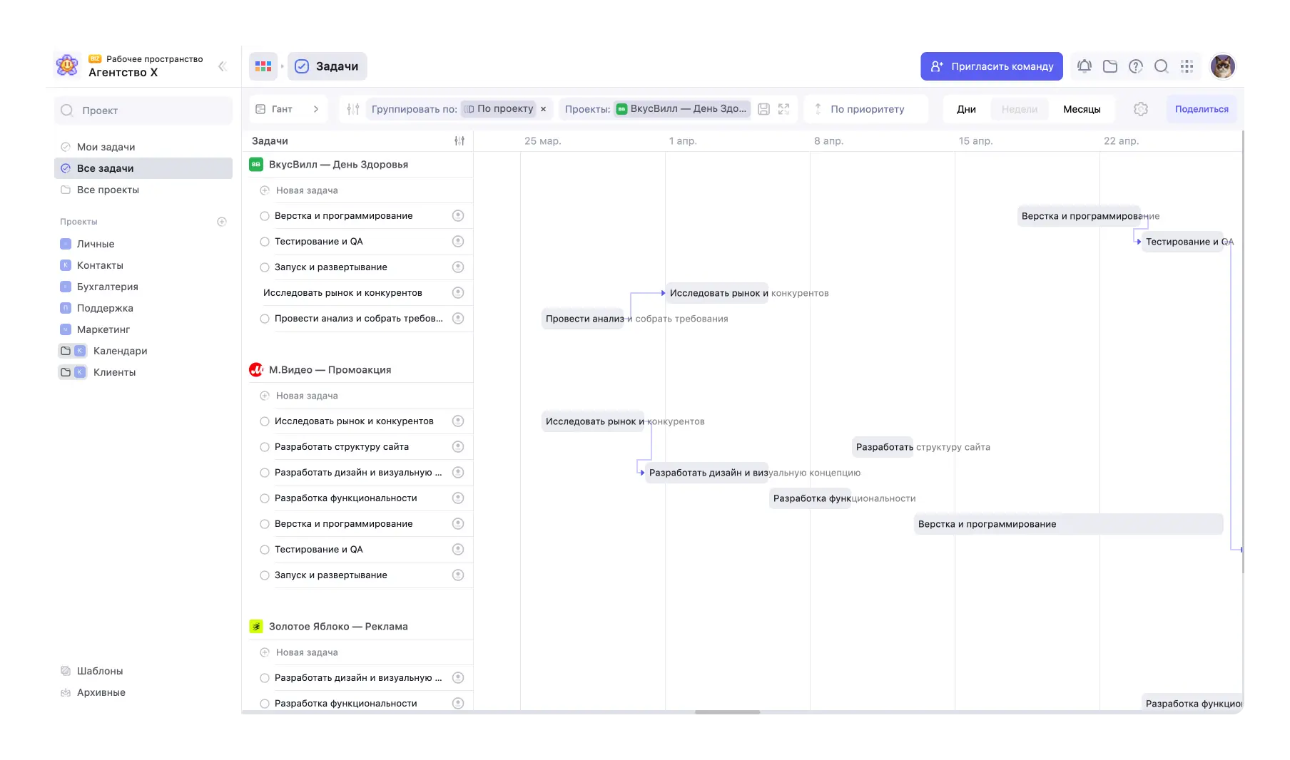 - Работать с задачами из одного пространства. На экране одновременно видна диаграмма с датами и список задач с приоритетом, статусом и исполнителем. Не нужно переключаться между вкладками.