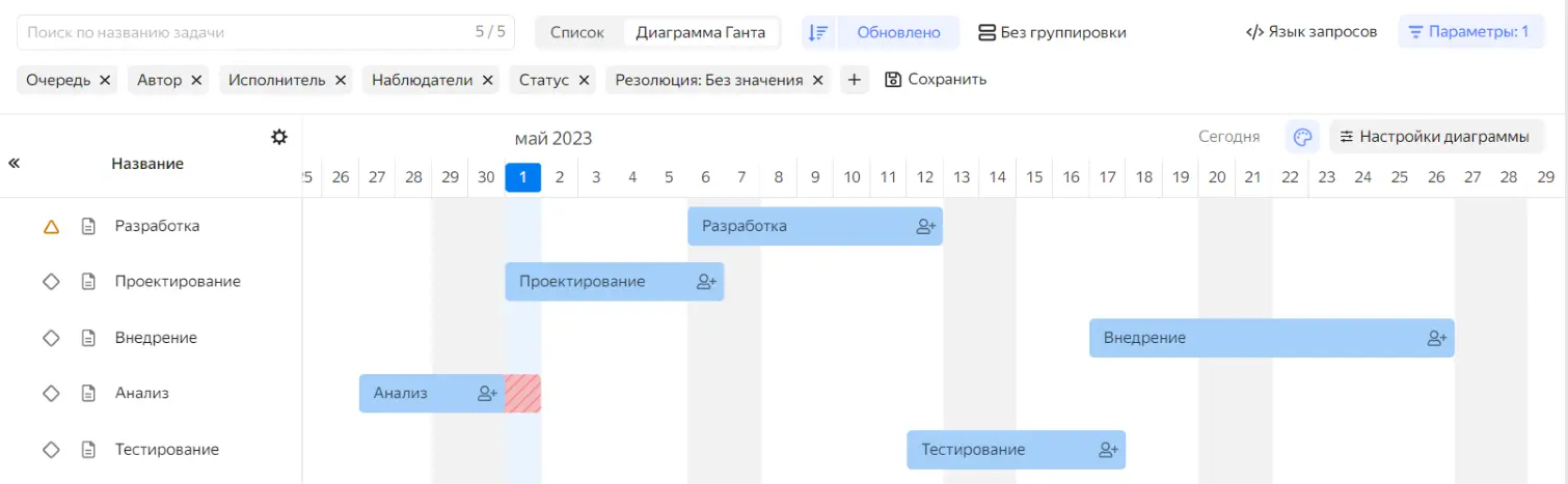 - Концентрироваться на важном. Используйте фильтры, чтобы оставлять на графике задачи конкретного исполнителя или статуса.