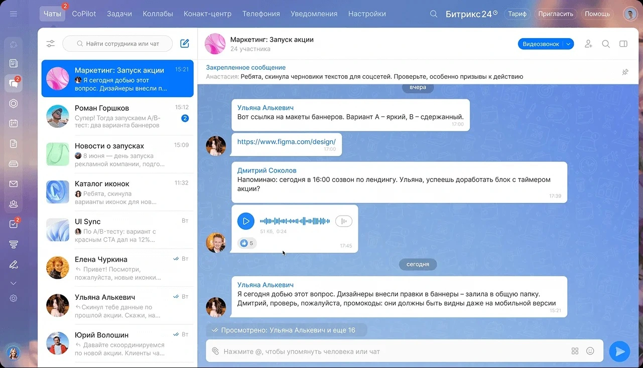 Все коммуникации происходят в едином пространстве, напрямую привязанном к рабочим объектам. Обсуждения можно прикреплять к конкретным задачам или клиентам, что повышает прозрачность и снижает вероятность утери важных данных.