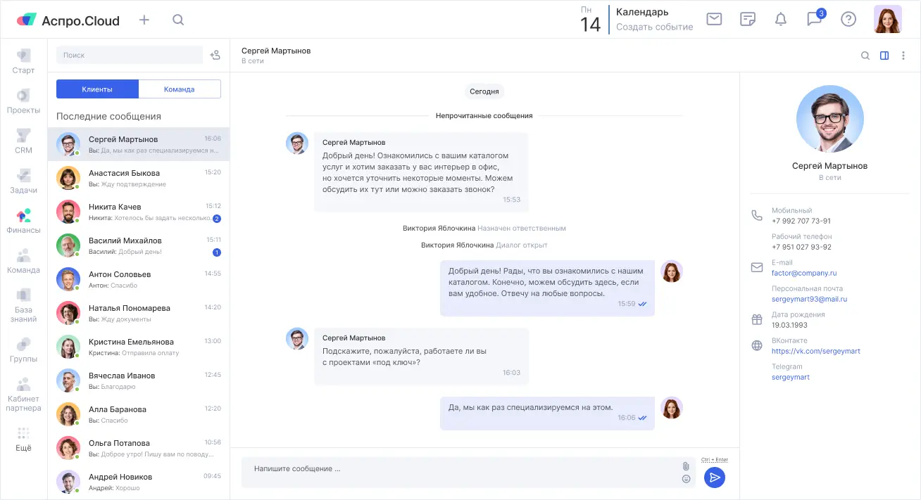 Аспро.Cloud — платформа для управления бизнесом, в которой общение интегрировано непосредственно в задачи, сделки и проекты. Используется для совместной работы, реализации проектов и взаимодействия с клиентами внутри процесса продаж.