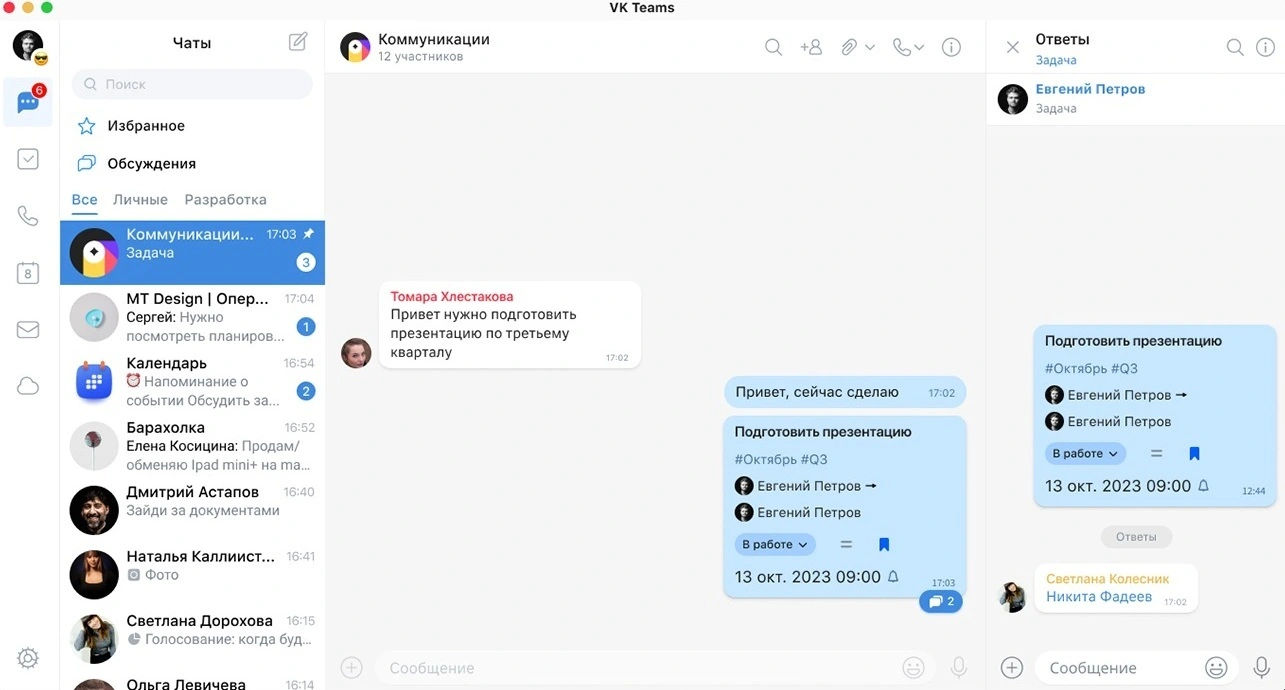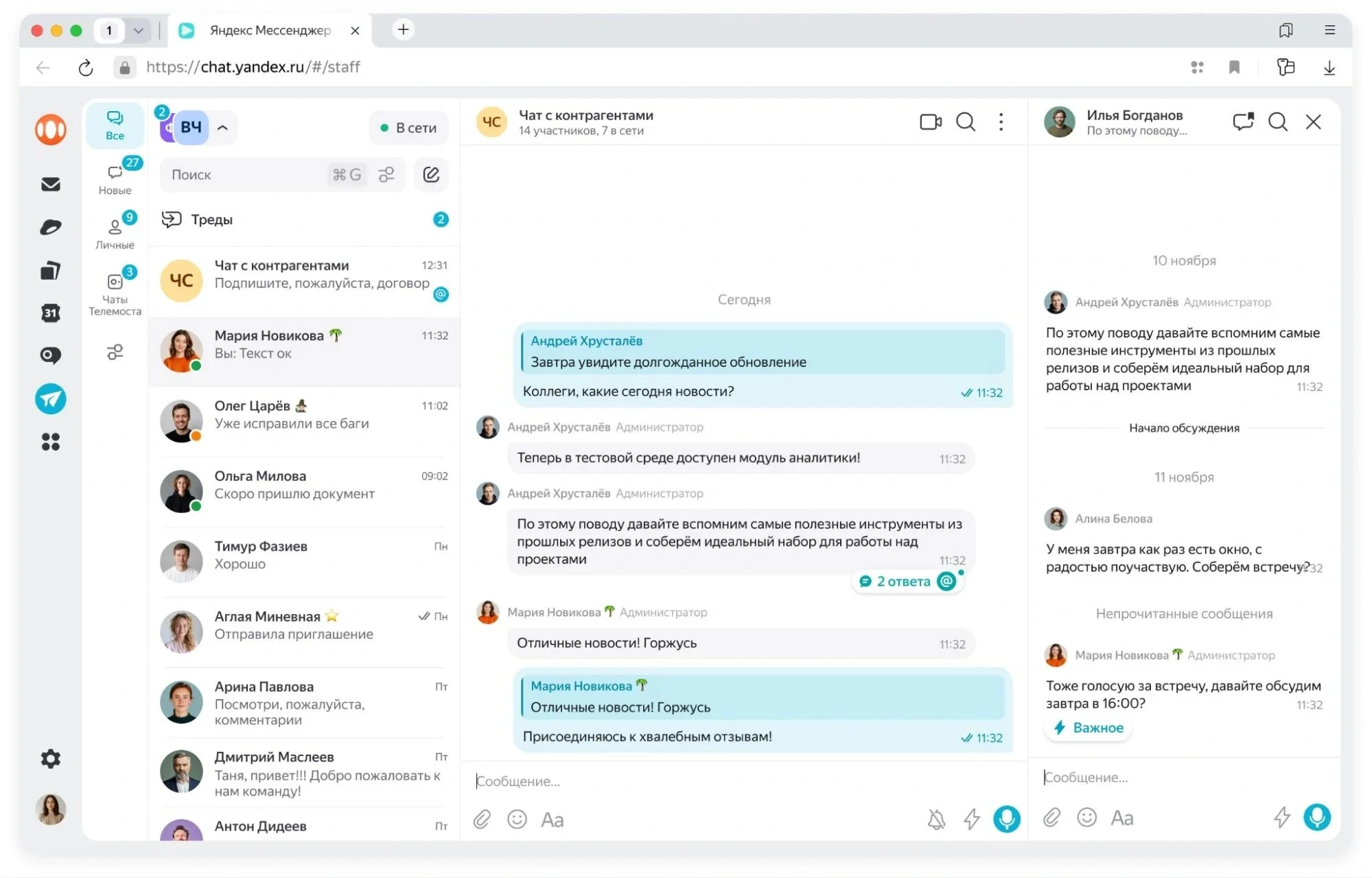 Сервис выходит за рамки обычного чата. Он предлагает комплексные инструменты для организации рабочего процесса — общение проходит в контексте проектов, сделок и задач, что позволяет всегда сохранять актуальный контекст и быстро находить ранее согласованные решения.