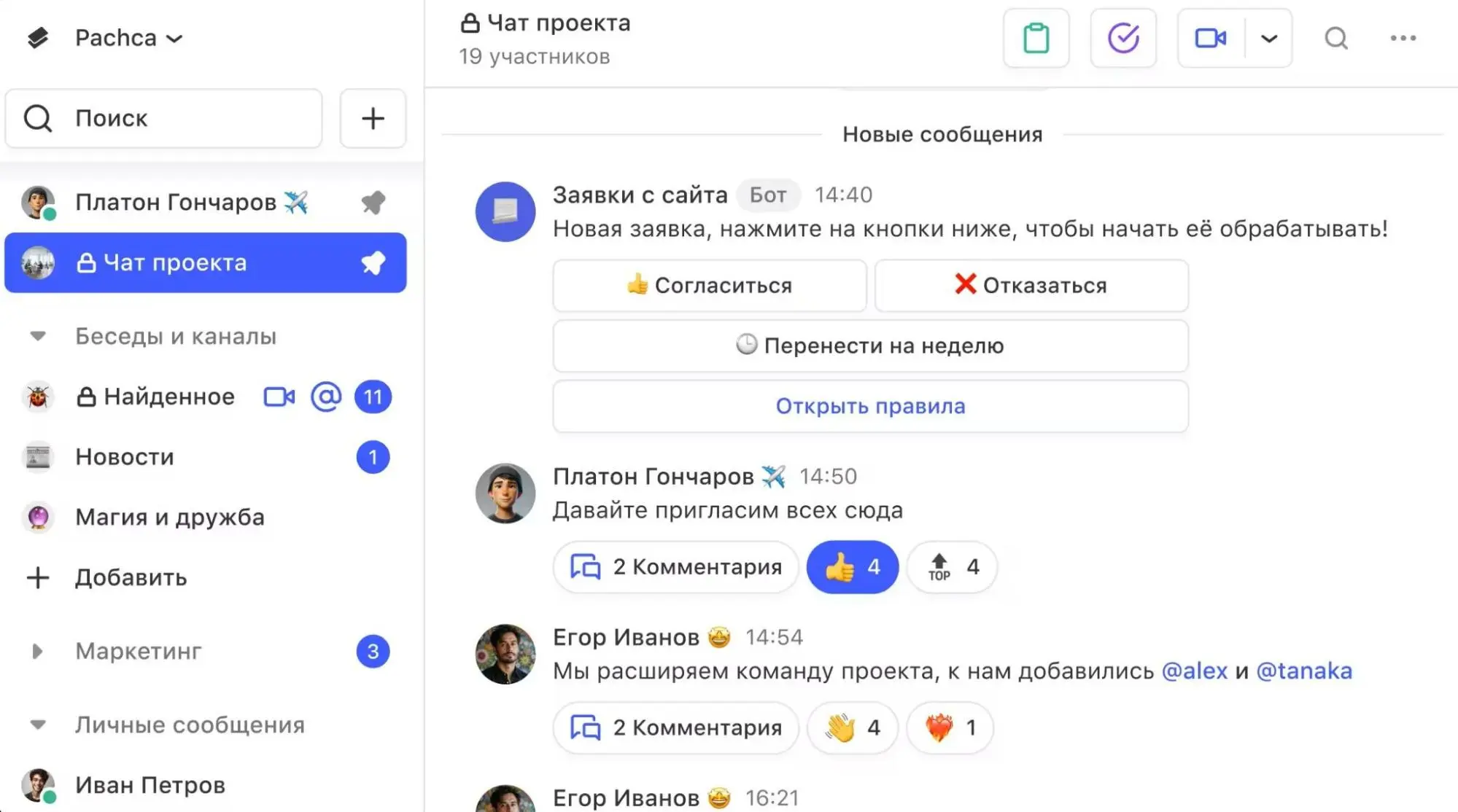 - Формат общения. В одних сервисах переписка остается привычной: чаты, каналы, обсуждения. Они подходят для быстрых вопросов и оперативных обсуждений. В других решениях коммуникация идет внутри задач и проектов. Такой подход упрощает контроль и помогает не терять договоренности.