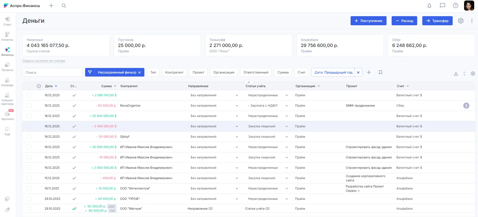 2. Раздел «Деньги». Все счета компании отображаются в одном окне. Данные загружаются автоматически или вручную, видны реестр операций и актуальные остатки в реальном времени.