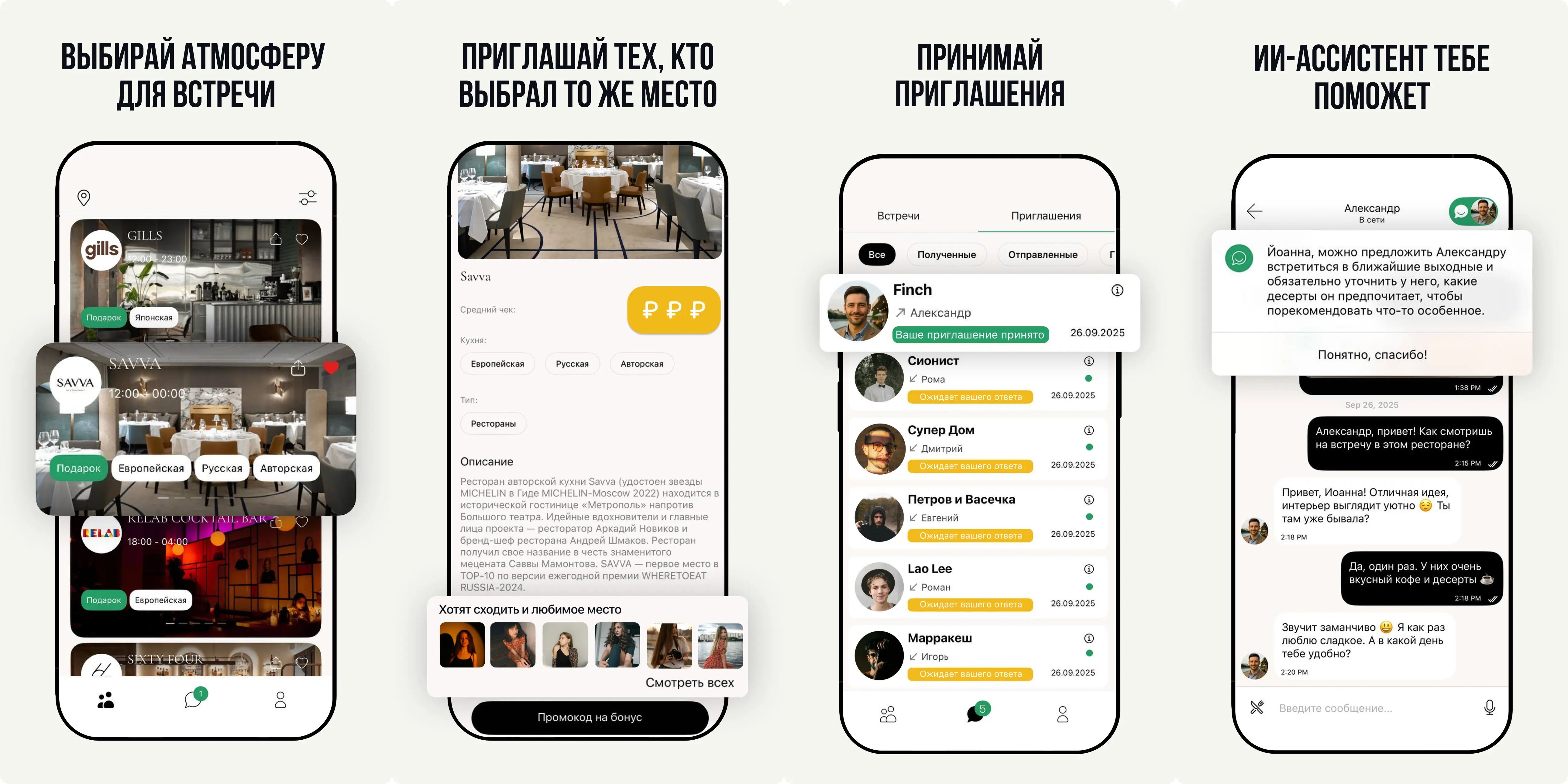 Сервис построен по принципу win-win: пользователи находят интересных людей и идеи для первых встреч, а заведения — новую лояльную аудиторию. Приложение работает более чем в 100 городах России: от Калиниграда до Владивостока. К проекту уже присоединились мишленовский ресторан Savva, модный бар Сионист, европейское кафе Finch и сотни других популярных заведений.