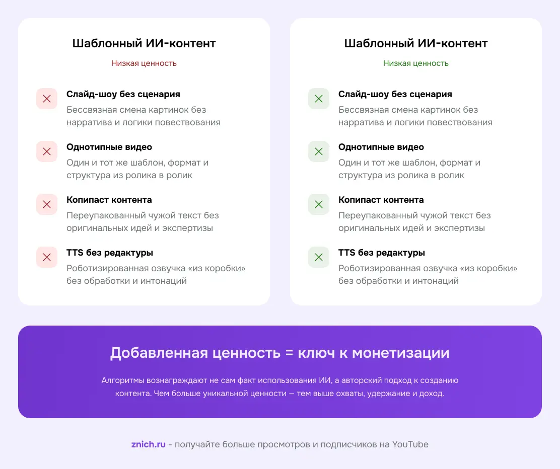 Главная причина отказа в монетизации ИИ-каналов — не сам факт использования нейросетей, а однотипность контента: одинаковые шаблоны без вариации формата, стиля и подачи.