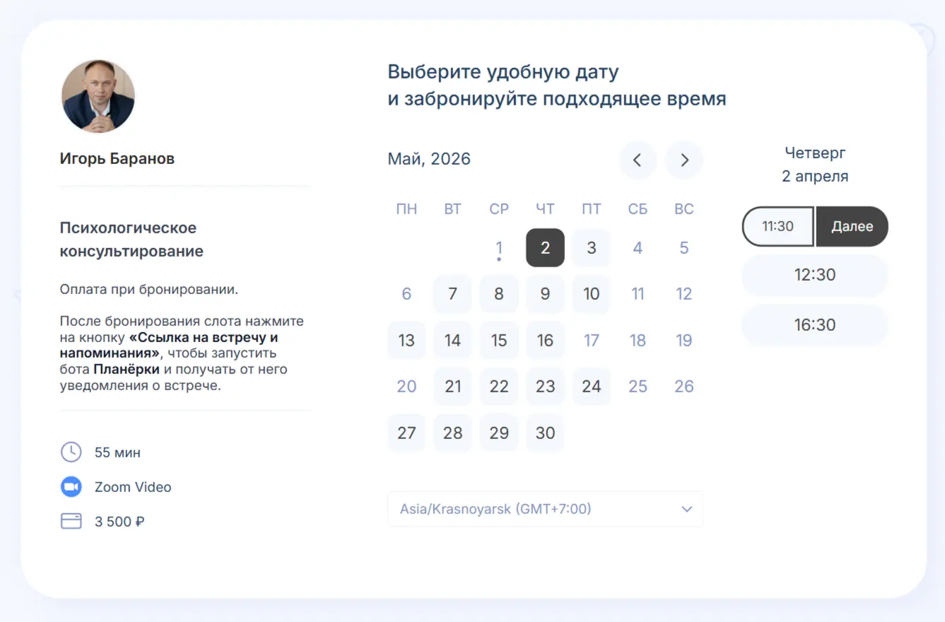 - Клиент открывает вашу ссылку и выбирает свободное время