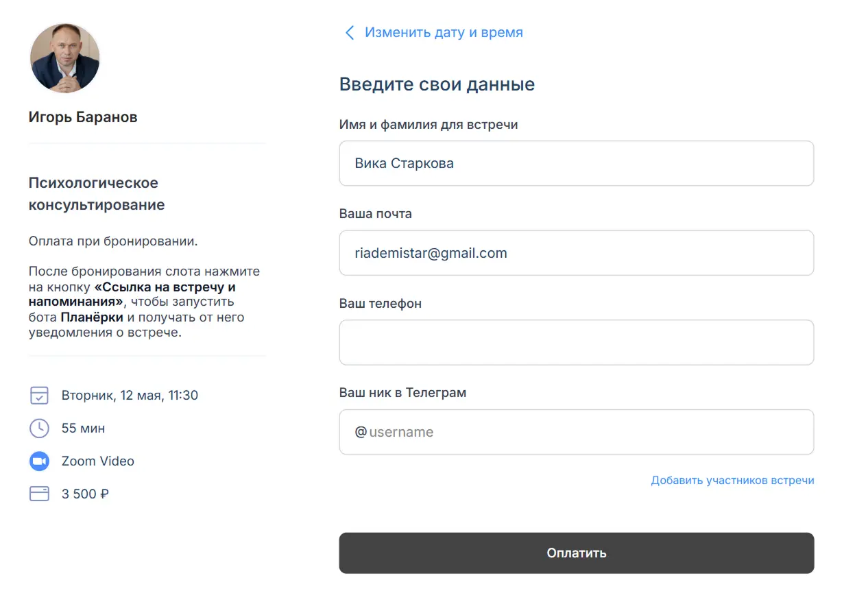 Результат: вы получаете оплату своего часа, не нужно вручную проверять чеки, подтверждать бронь в переписке и создавать ссылки на видеозвонки.