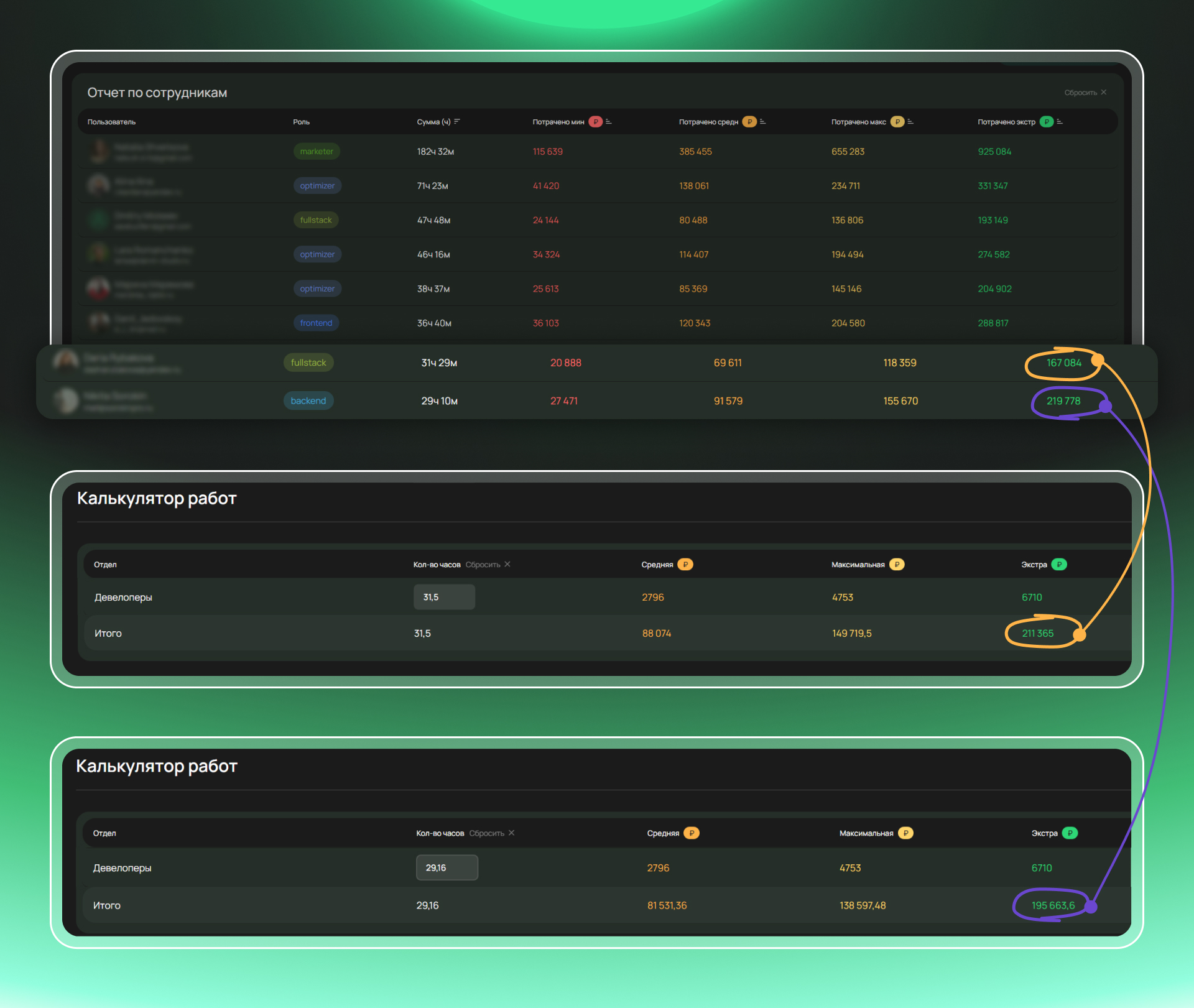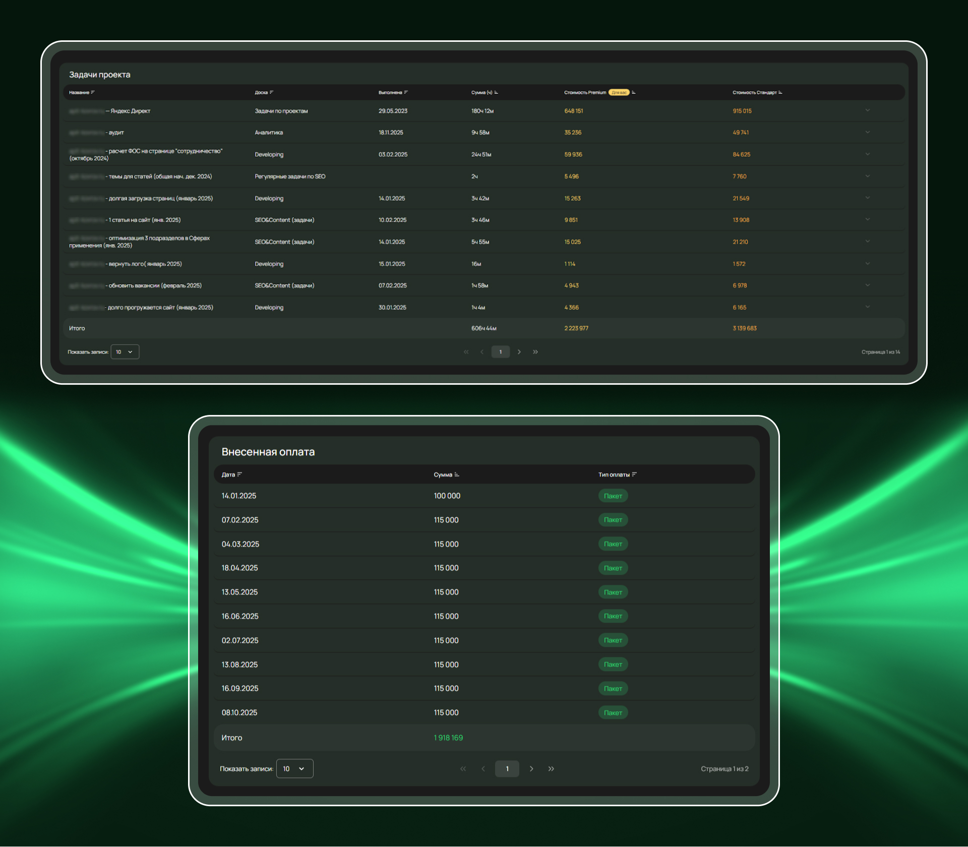 Работает это довольно просто по своей логике, хотя внутри расчёты, конечно, сложнее. Система берёт задачи и время из рабочего пространства, где команда ведёт проект. Дальше к этому времени привязываются реальные люди, которые выполняли работу, и реальные расходы компании. После этого всё сравнивается с оплатами клиента за выбранный период. В итоге получается не просто история о том, что было сделано, а модель реальной стоимости работ.