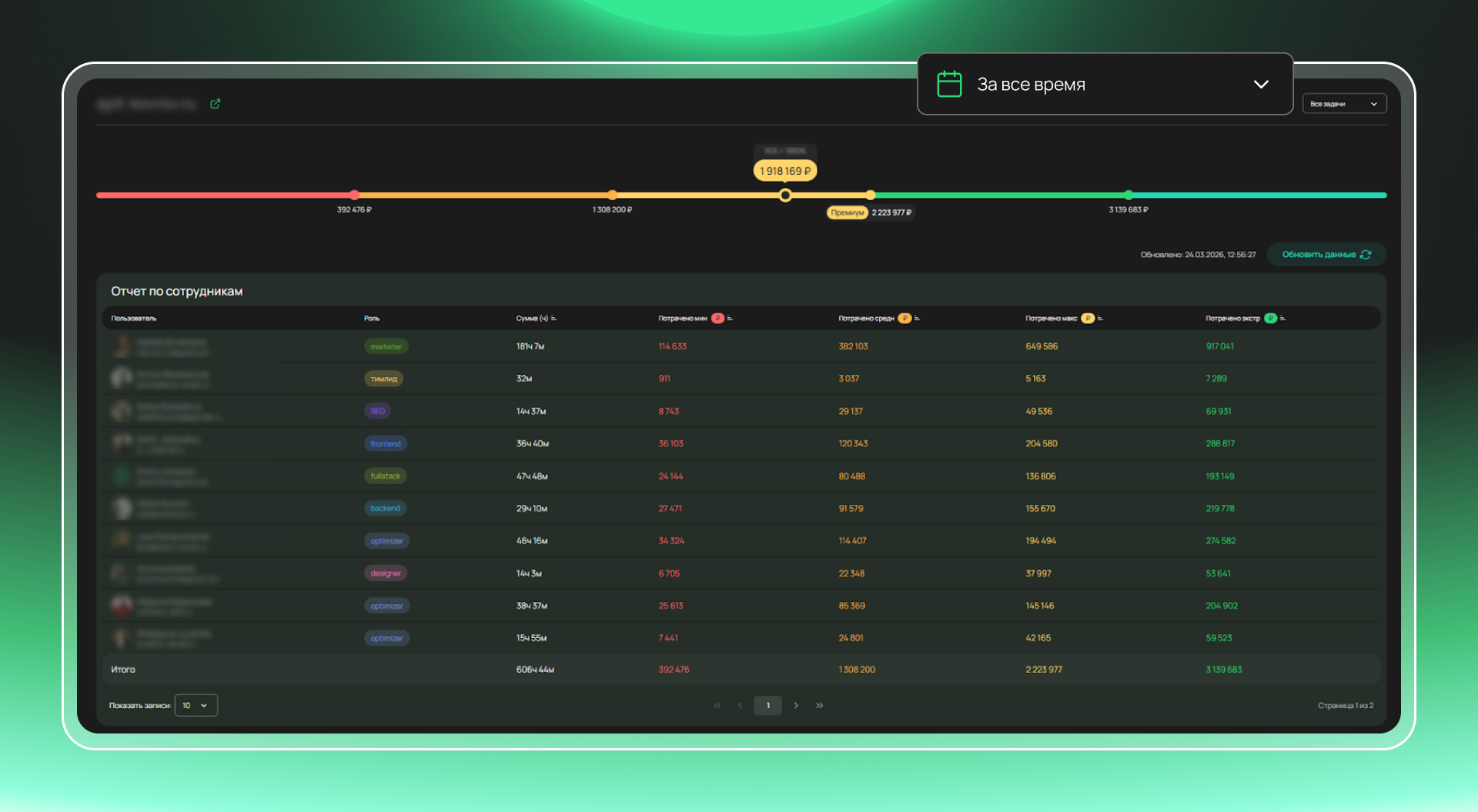 Для агентства система показывает другую сторону этой же картины. Здесь уже важны не только выполненные задачи, но и то, сколько реально стоит проект для команды. Где идёт перерасход. Где, наоборот, есть недоработка. Какие проекты выглядят нормально только на уровне ощущений, но по факту уже близки к убыточности. А какие, наоборот, можно усиливать, потому что по ним ещё есть запас.