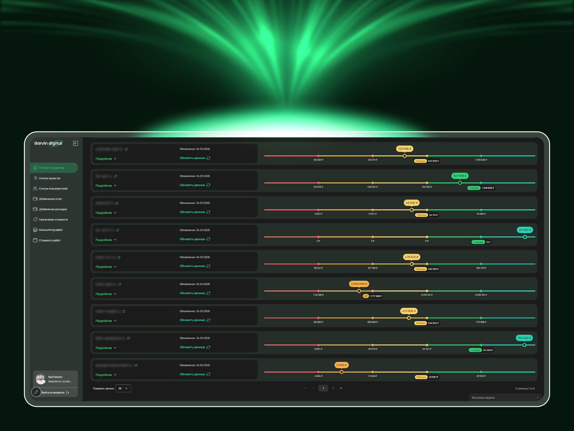 Так пришли к мысли собрать систему, которая будет не просто хранить задачи и время, а переводить их в деньги. Чтобы можно было увидеть реальную стоимость работ, сравнить её с оплатами клиента и понять, что происходит с проектом на самом деле. Именно так появилась основа Darvin Economy.