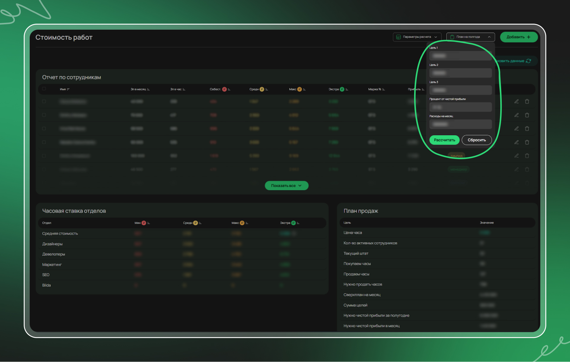 Сервис считает стоимость работ через набор параметров. Часть из них отвечает за общую финансовую рамку бизнеса, например, цели на период, расходы на месяц и желаемую прибыль.