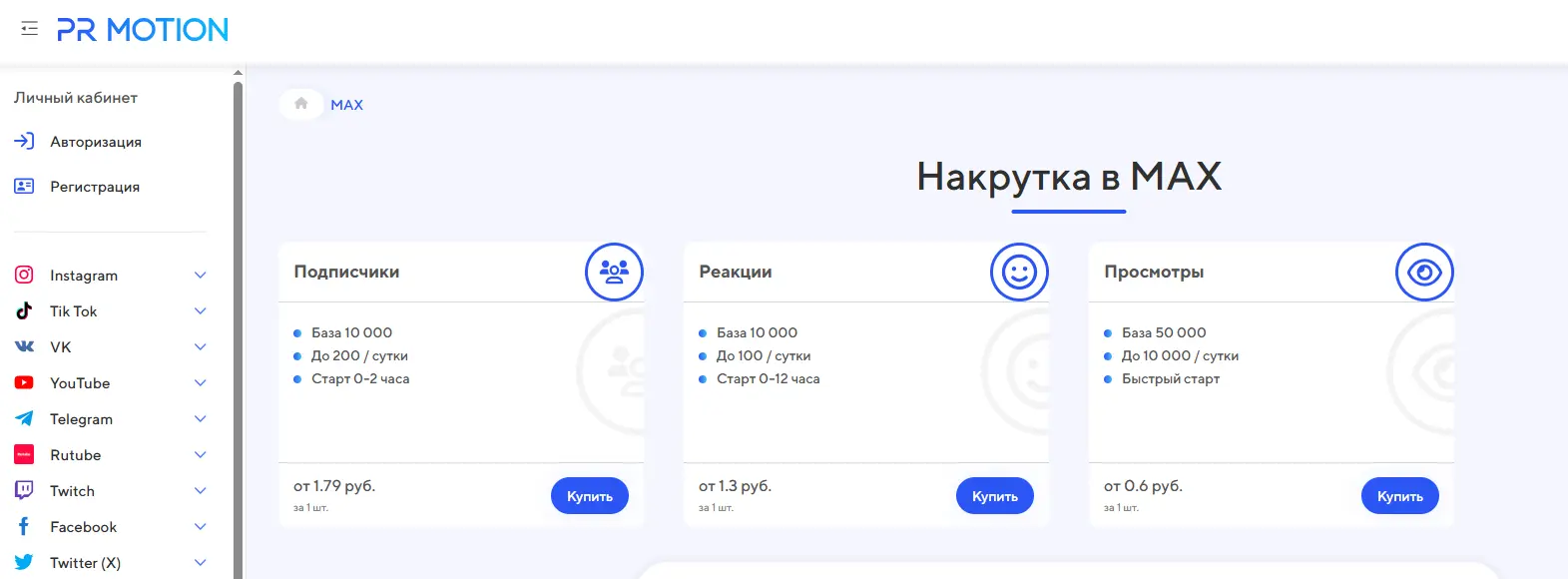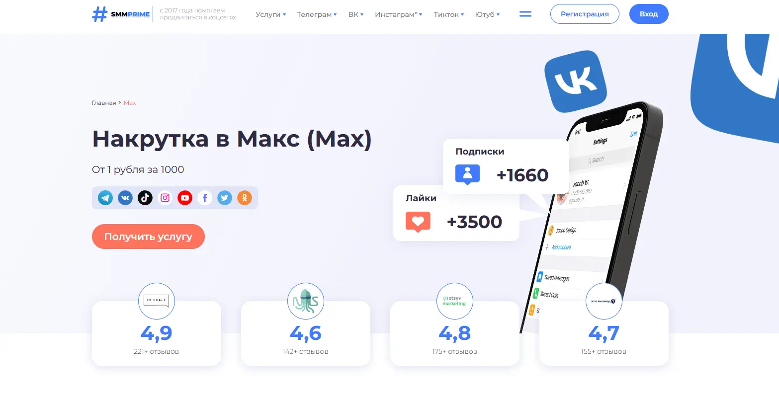 Крупный «гипермаркет» цифровых услуг, где накрутить в Max голос на пост можно как отдельными пакетами, так и в виде подписок на регулярную накрутку. Накрутка идет через стандартные готовые тарифы, без сложных настроек: выбираете тип услуги, объем и оформляете заказ. Сервис ориентирован не только на частных пользователей, но и на бизнес: есть опция работы по договору и большой общий каталог SMM‑услуг под разные площадки.