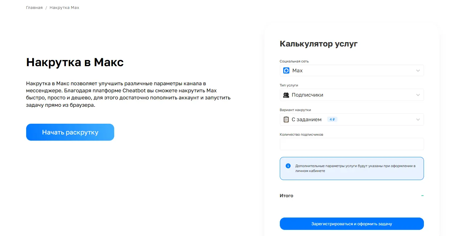 Сервис накрутки, который сочетает автоматизацию с участием живых пользователей: задания выполняют реальные люди из России и СНГ. В MAX здесь можно накручивать все ключевые метрики канала — подписчиков, просмотры, реакции, комментарии, репосты и голоса в опросах — через личный кабинет без доступа к аккаунту. Накрутка запускается в формате задач: вы задаете ссылку, нужный объем и параметры, а система распределяет задания между исполнителями и крутит активность 24/7.