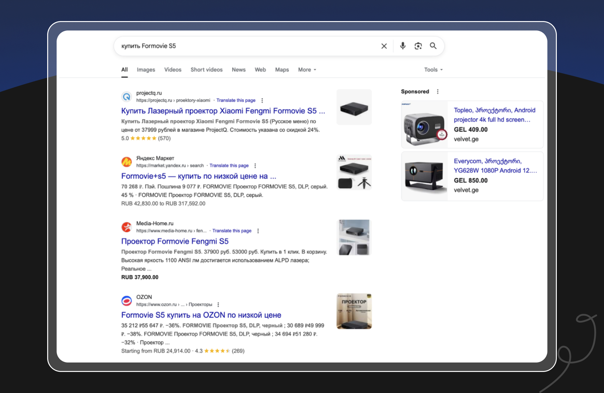 По запросам, связанным с покупкой проекторов, ProjectQ также входит в список рекомендованных магазинов рядом с крупными площадками.
