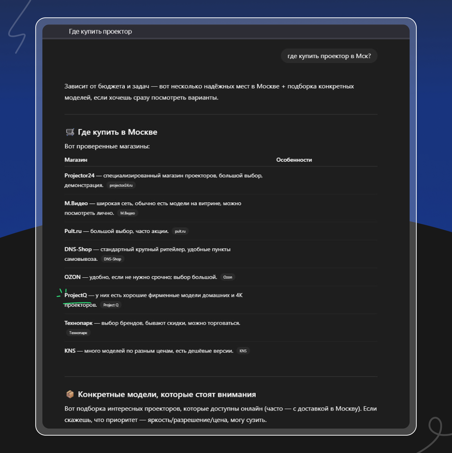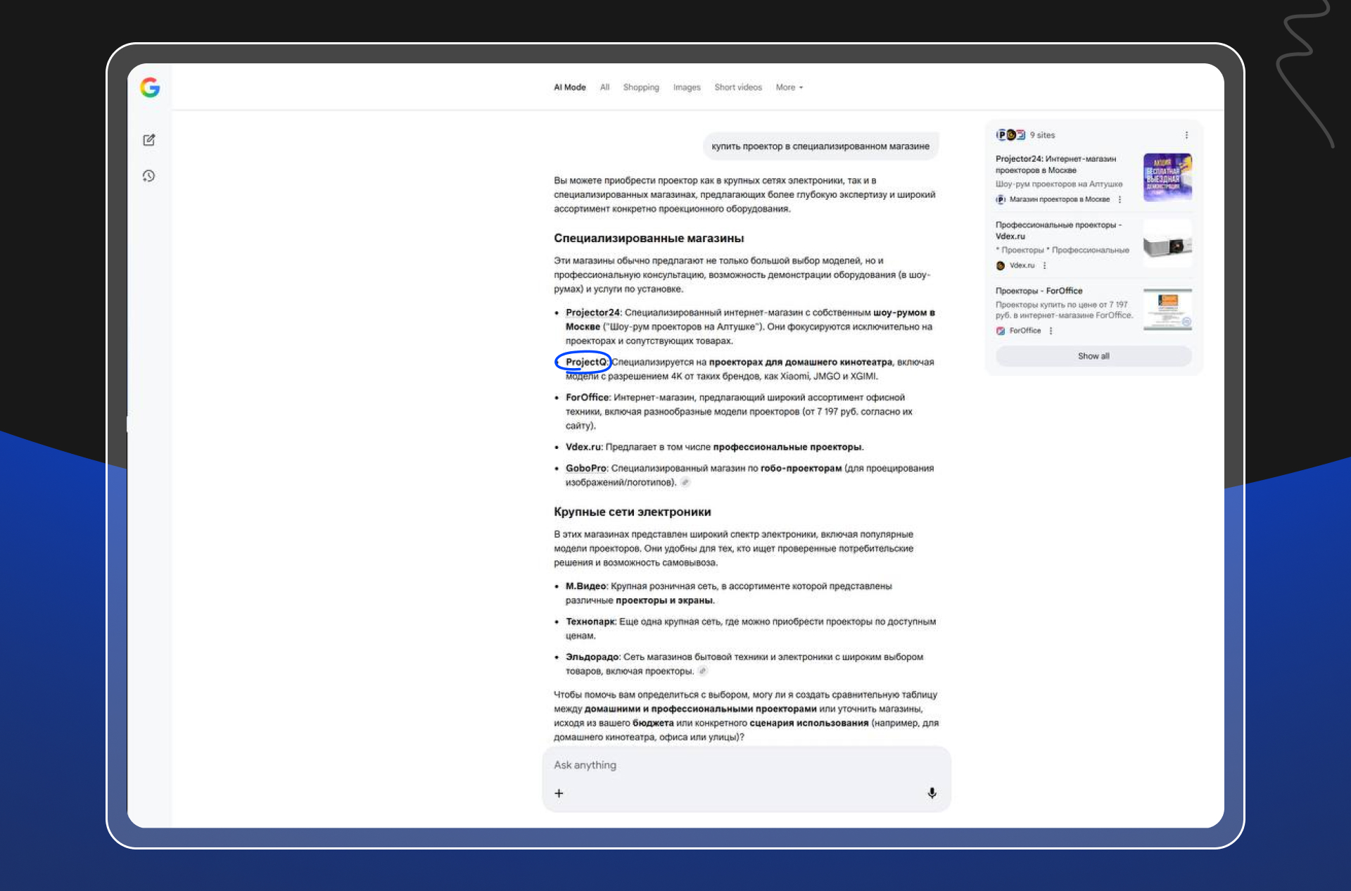 Когда мы решили узнать у Google AI Mode ответ на запрос «купить проектор в специализированном магазине», ИИ структурировал ответ по категориям: