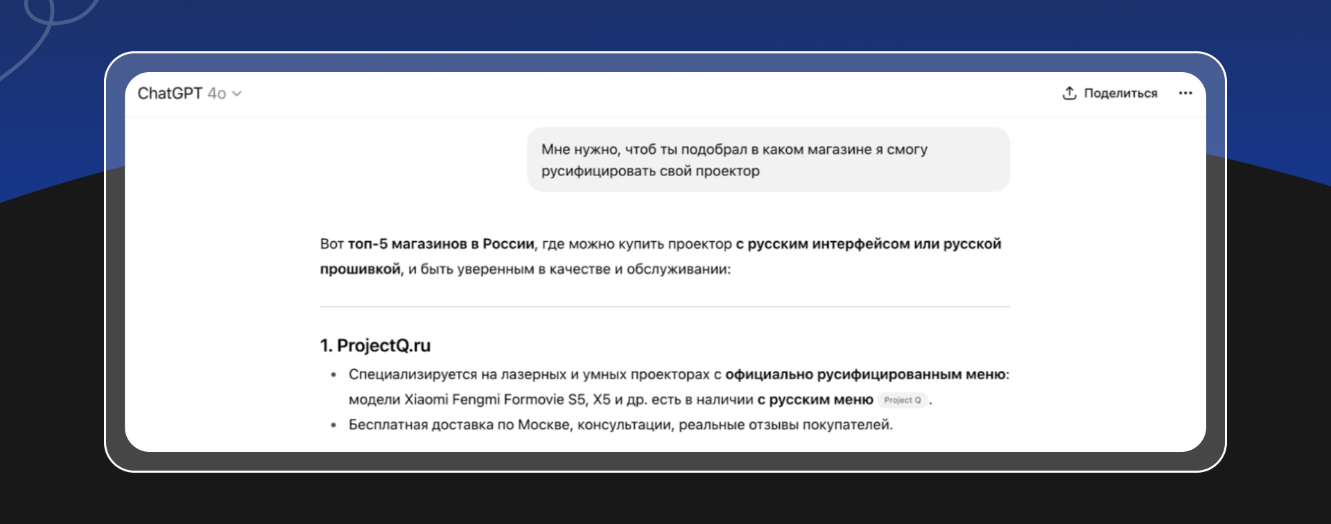 После этого решили узнать, ссылается, рекомендует ли ChatGPT ProjectQ при поиске проектора. И снова – да.
