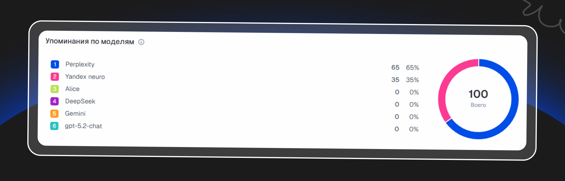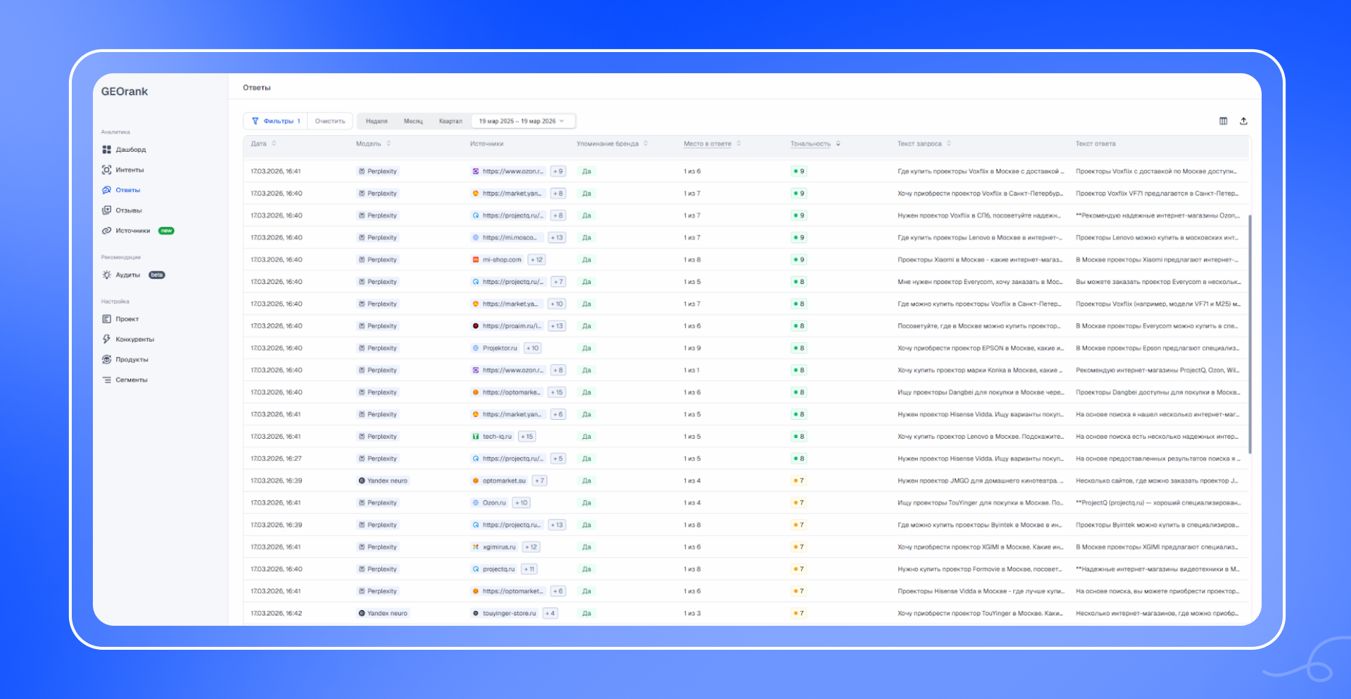 Чтобы понять, насколько часто ProjectQ вообще появляется в нейросреде, мы дополнительно посмотрели видимость бренда в AI-системах через специализированные сервисы мониторинга GEOrank и «Пиксель Тулс». Они собирают ответы разных нейросетей по тематическим запросам и фиксирует, какие бренды и сайты упоминаются чаще других.