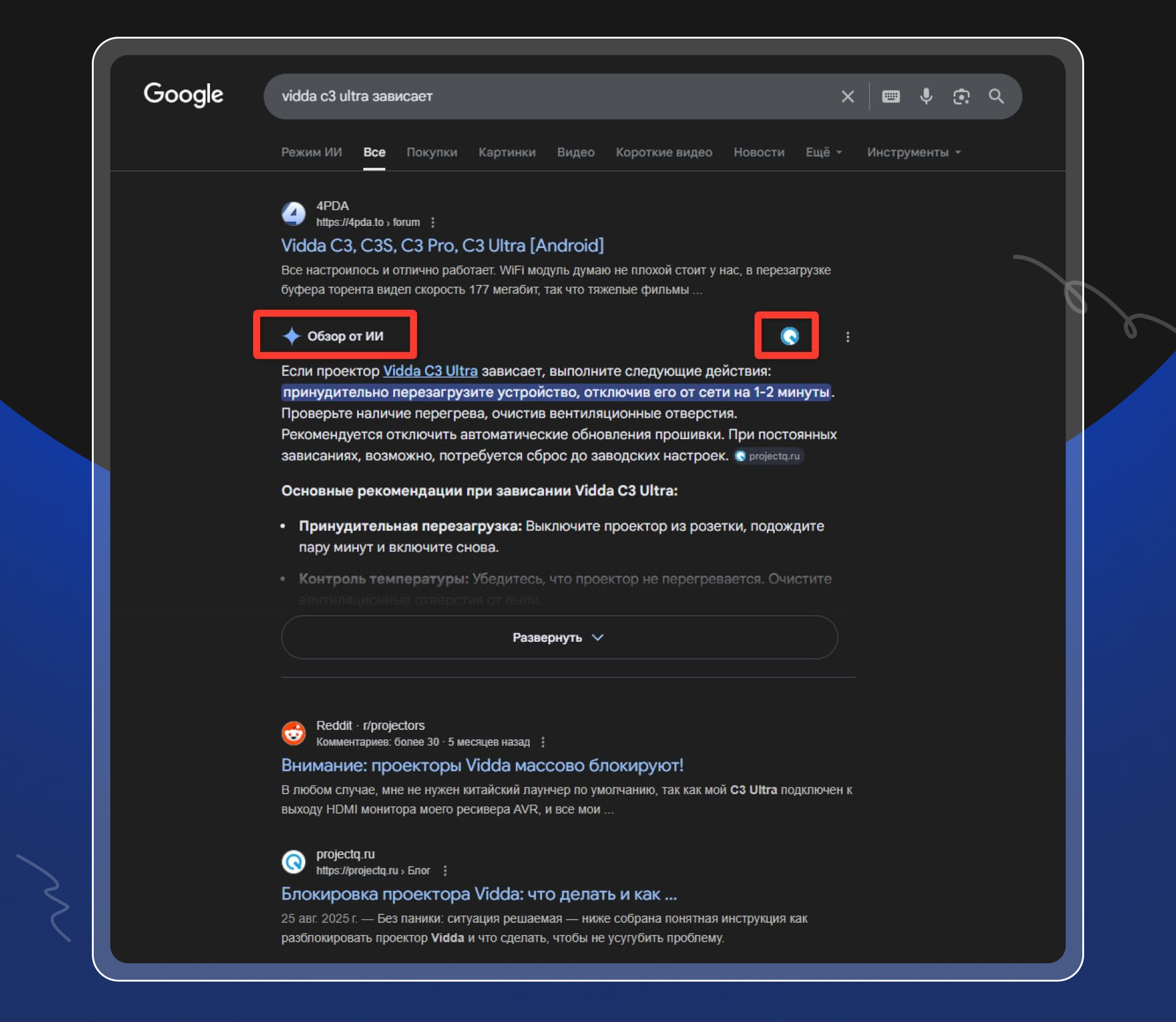 По запросу «vidda c3 ultra зависает» AI-ответ от Google скомпонован так, что верхний результат – именно от projectq.ru с пометкой «Обзор от ИИ». Он содержит подробный разбор причин зависаний и практические шаги по решению. Это структурированный ответ, поэтому его рекомендуют нейросети.