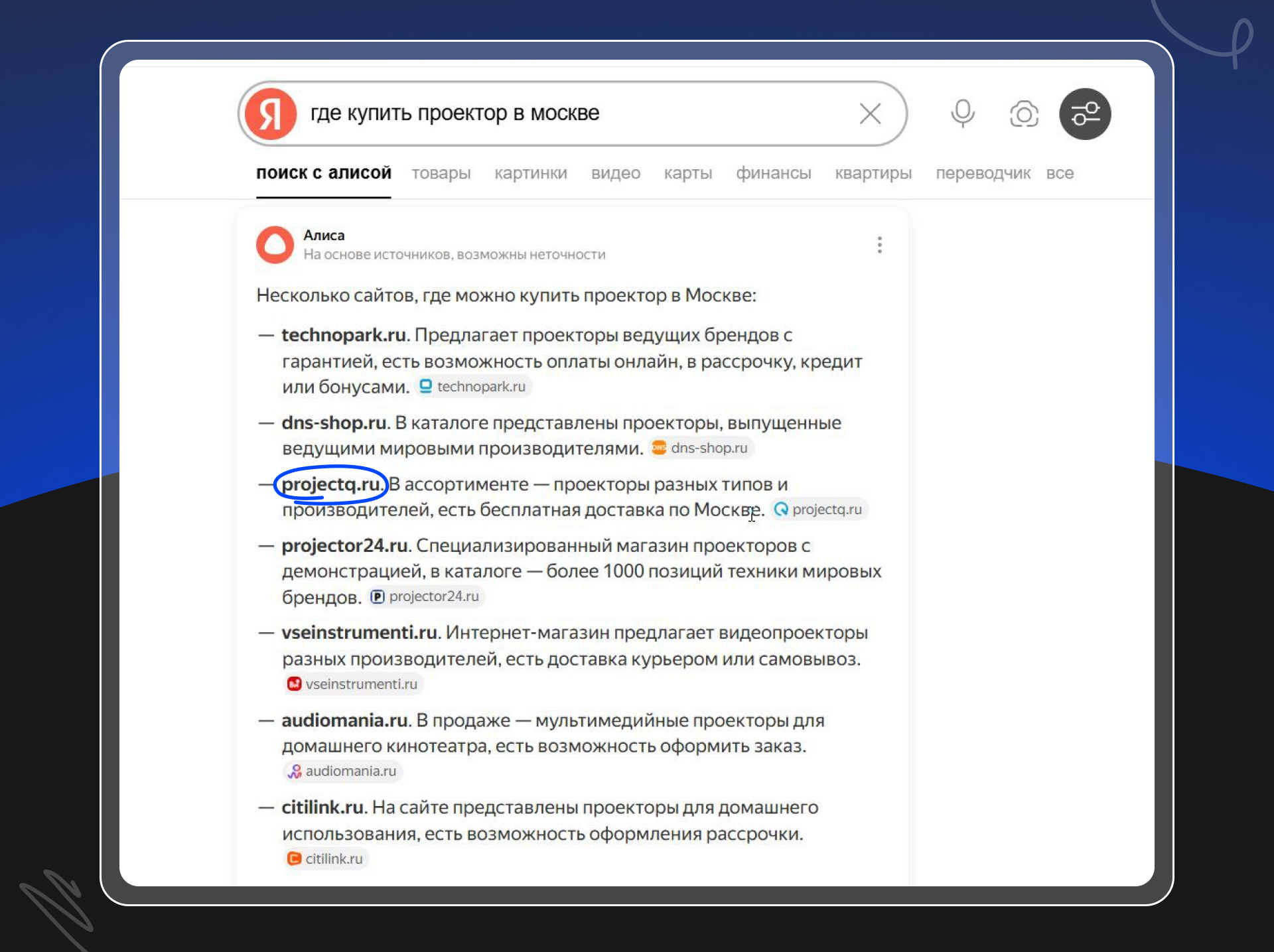 По запросу «где купить проектор в Москве» ответ Алисы выделяет несколько релевантных сайтов, где снова есть projectq.ru. Ответы собраны так, что дают системную картину: где можно купить проектор в Москве с разбивкой по типам магазинов.