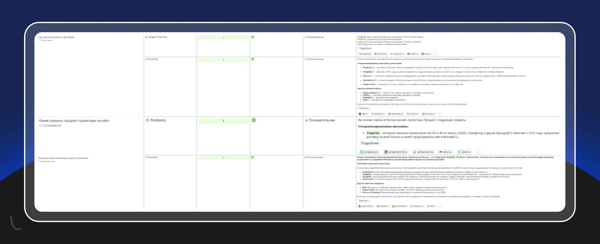 Даже при сравнении с крупными ритейлерами и специализированными магазинами бренд ProjectQ регулярно появляется в AI-ответах. Это важно: нейросети не выбирают источники только по размеру компании. Для них гораздо важнее, чтобы сайт давал подробные, понятные и структурированные ответы на реальные вопросы пользователей.