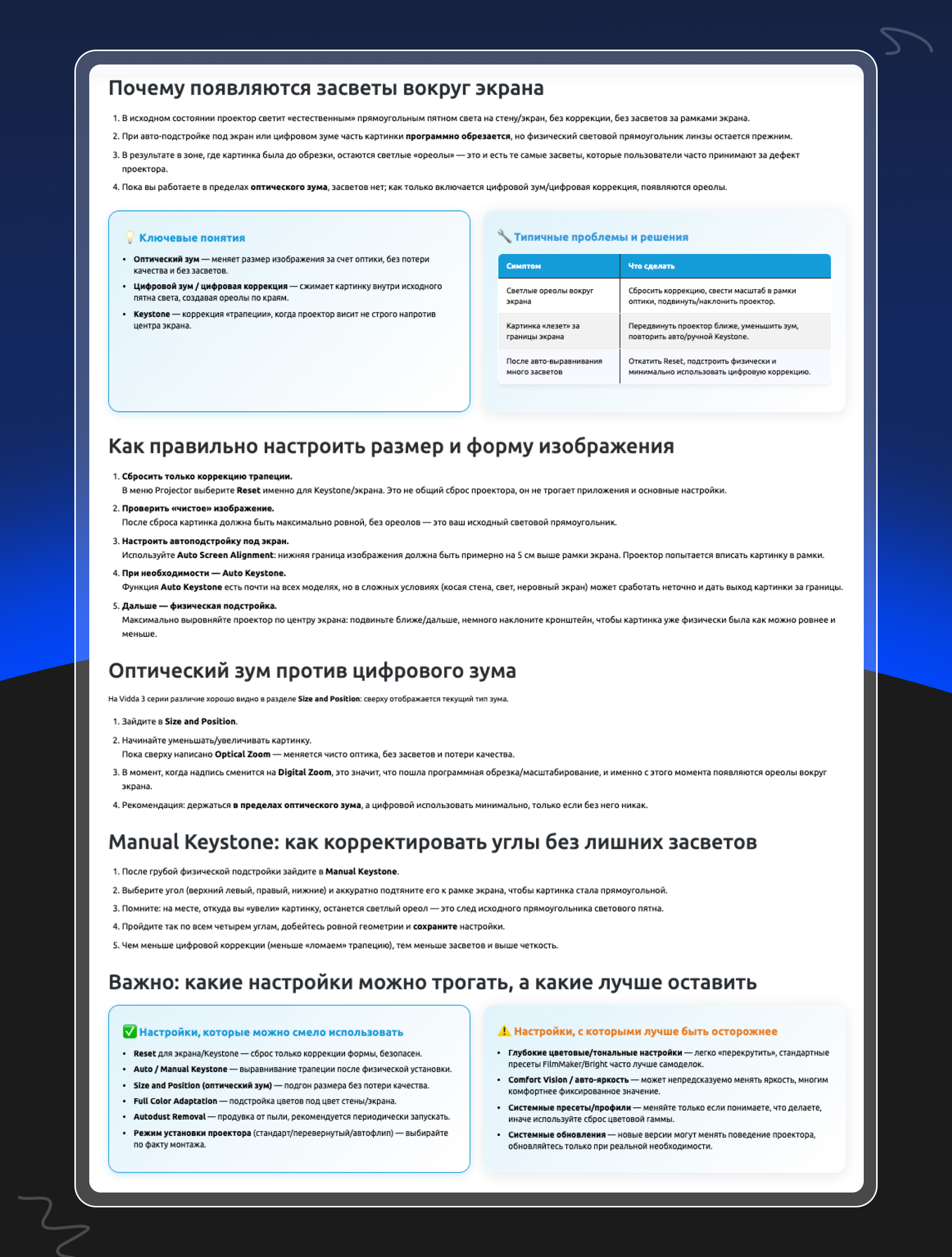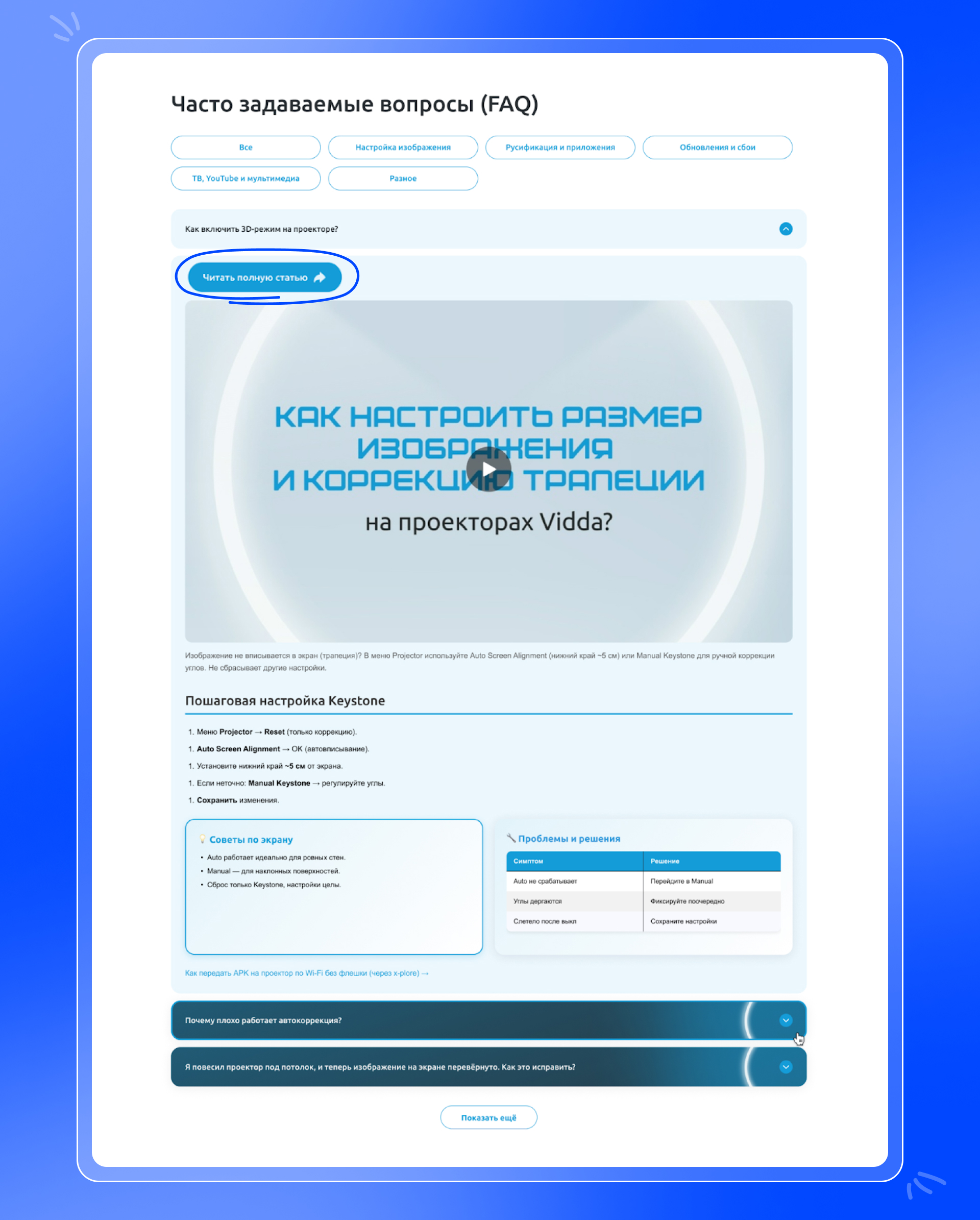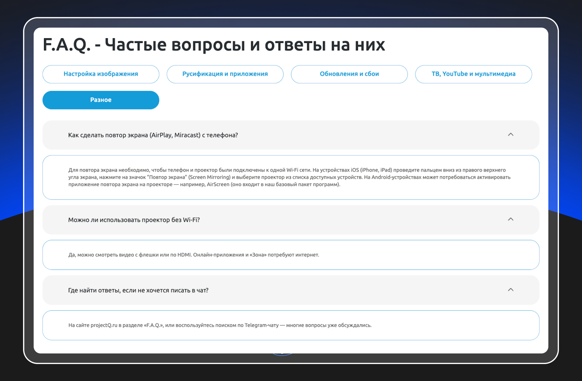 Источник информации – реальные обращения клиентов. Мы фиксировали повторяющиеся вопросы и превращали их в отдельные страницы с ответами. Важно, что мы не стали складывать все ответы в одно место. Часть вопросов требовала короткого и быстрого ответа – например, как обновить проектор или где включается нужная настройка. Такие вещи пользователь хочет увидеть сразу, без переходов и длинного чтения. Их мы вынесли в раздел FAQ.