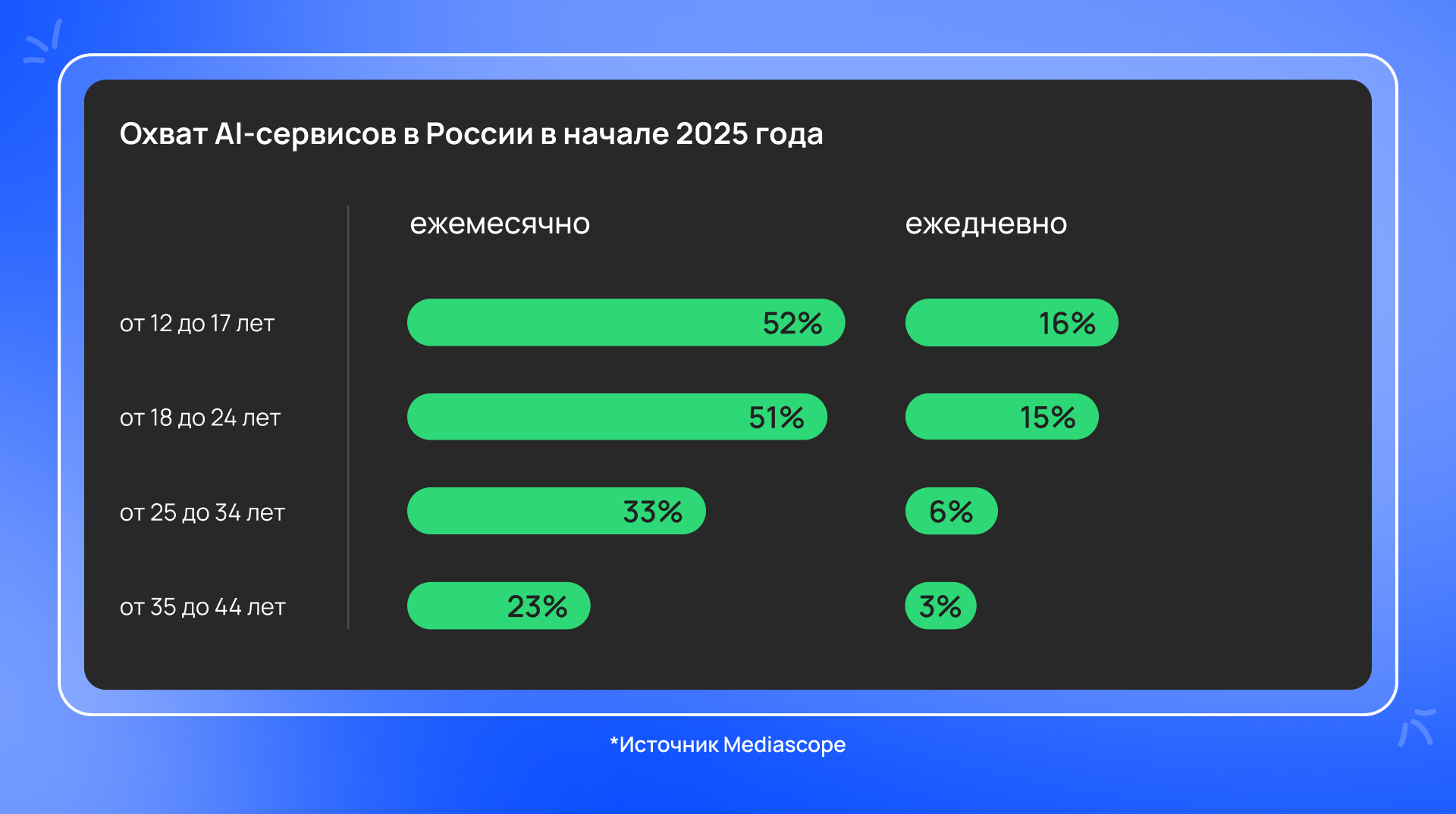 По данным исследовательской компании Mediascope, месячный охват AI‑сервисов в России в начале 2025 года составлял 26% населения.