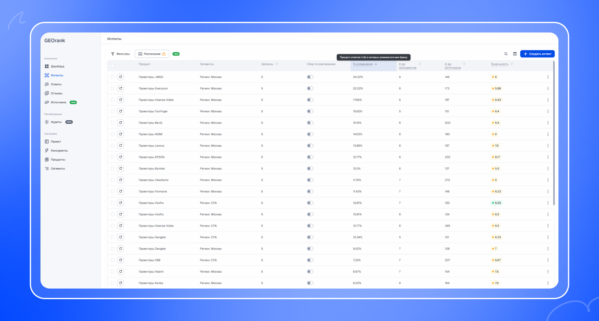 Чтобы проверить, как часто бренд ProjectQ вообще появляется в нейроответах по товарным интентам, мы посмотрели сводную аналитику по группам запросов в GEOrank. Этот отчёт показывает долю упоминаний бренда в ответах LLM по разным категориям и помогает понять, в каких продуктовых темах сайт уже заметен для нейросетей, а где видимость ещё можно усиливать.