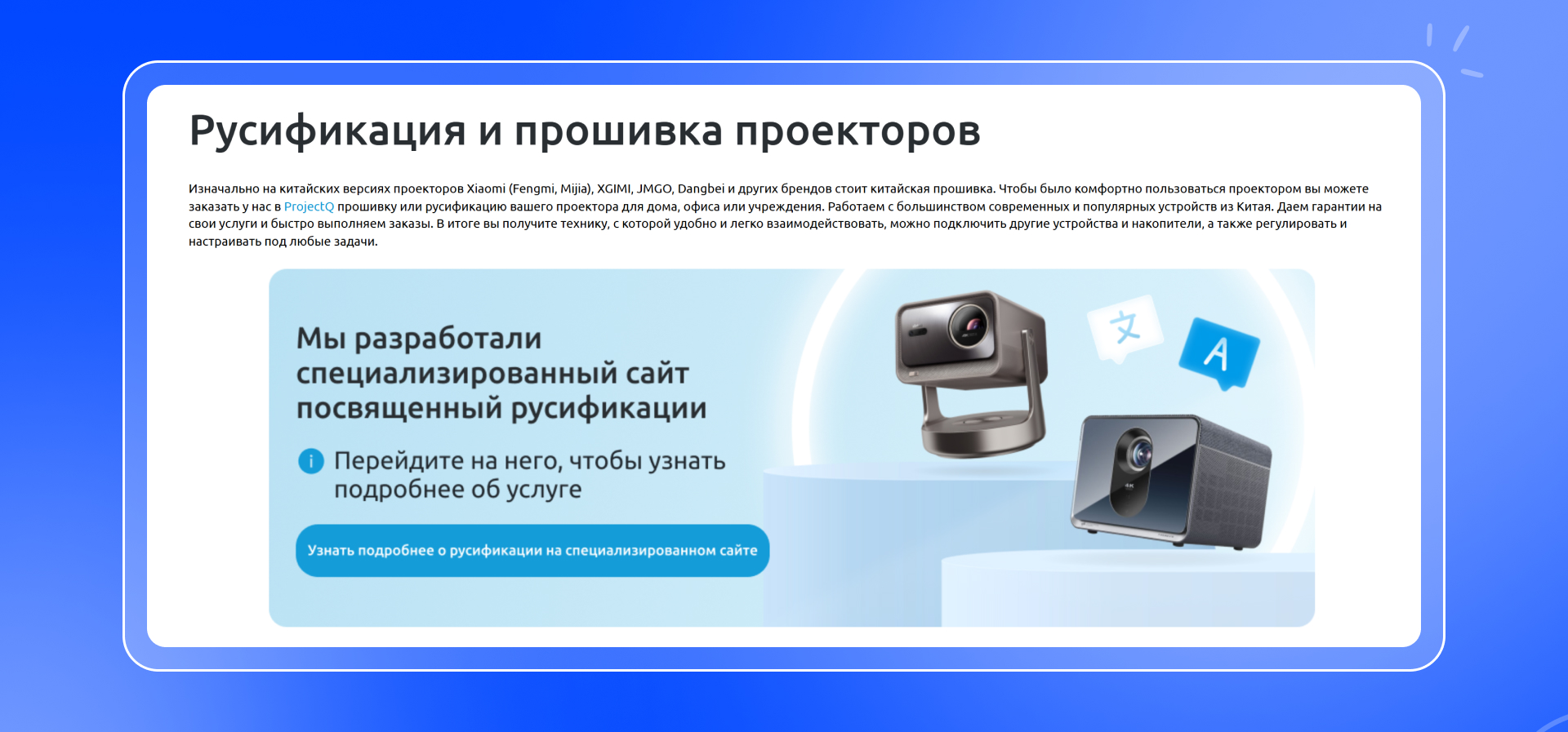 Заметили, что владельцы проекторов, купленных на китайских площадках, часто искали в поиске «русификацию проектора». ProjectQ уже решал эту проблему – устройства продавались с готовым русским интерфейсом.