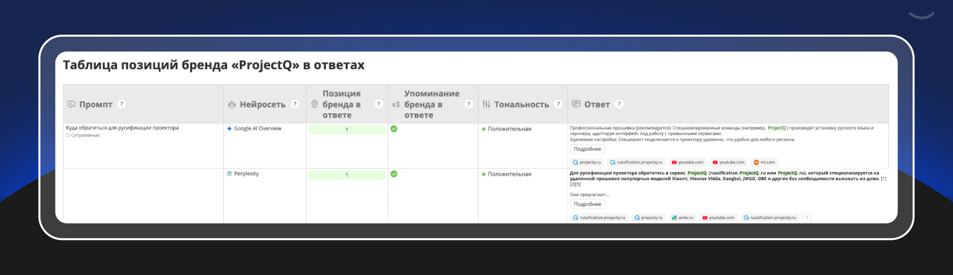 Затем мы проанализировали не только общую видимость, но и конкретные запросы, по которым нейросети упоминали бренд ProjectQ. Там же информация о месте сайта в ответе.