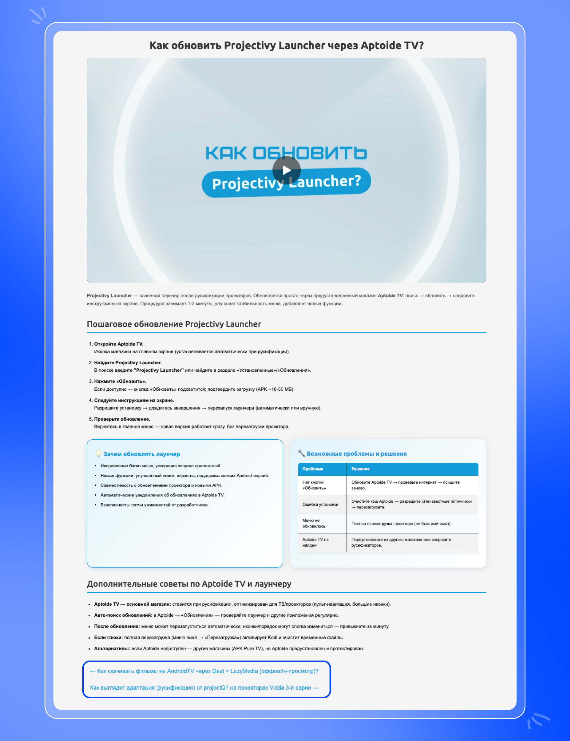 Более сложные темы: выбор модели, сравнения, инструкции или разборы проблем – оформляли как отдельные статьи в блоге.