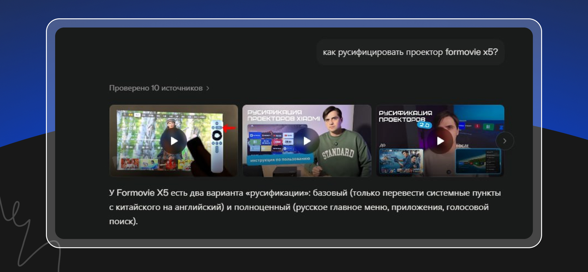 По частому запросу «как русифицировать проектор formovie x5» ChatGPT показывает результаты с YouTube-роликами и текстовыми материалами, в том числе из projectq.ru, где есть максимально полезные пояснения и инструкции.