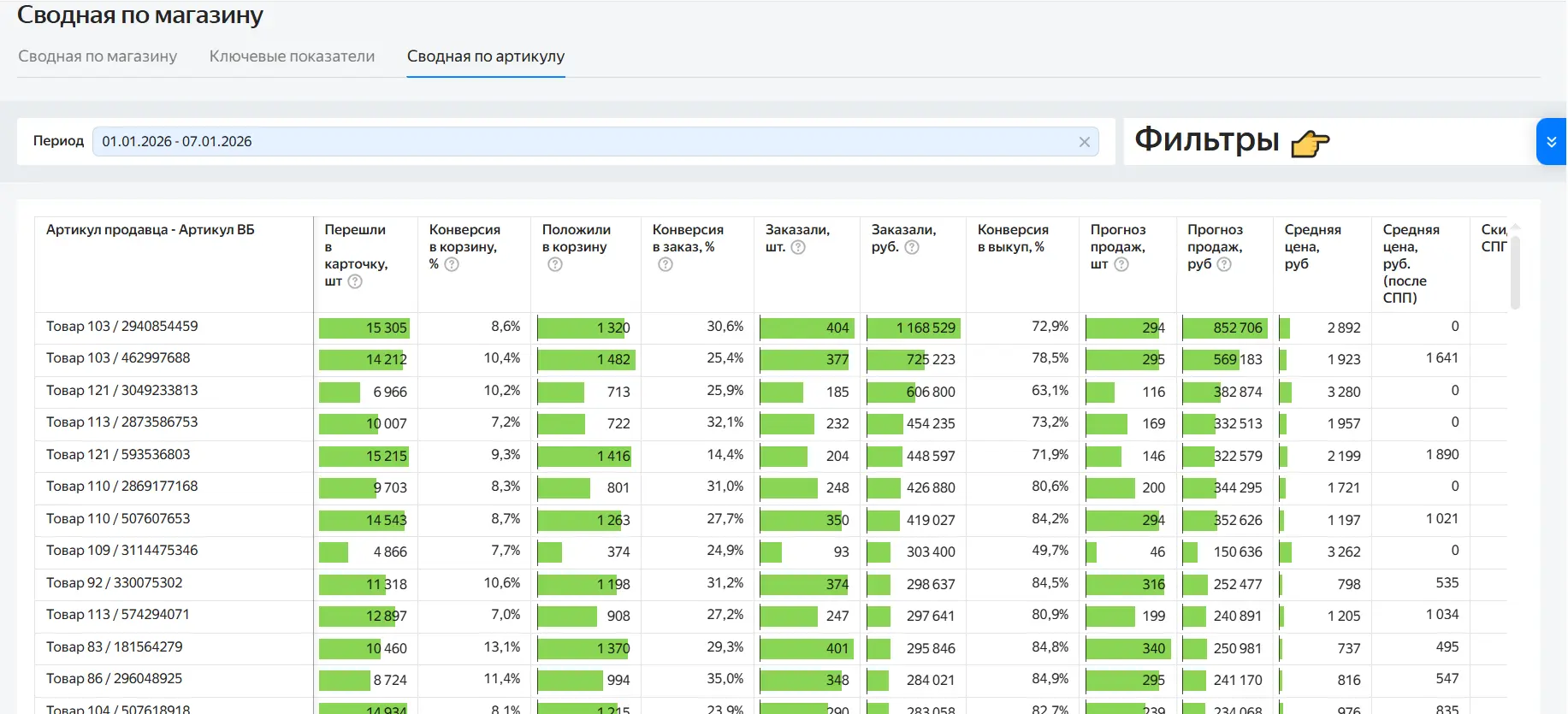 Еще один дашборд — детализация по каждому товару. Там видно переходы в карточку, добавления в корзину, заказы, выручку и конверсии на каждом этапе, процент выкупа, цены и прогноз продаж. Это позволяет сравнивать товары между собой и быстро находить позиции, которые дают результат или проседают.