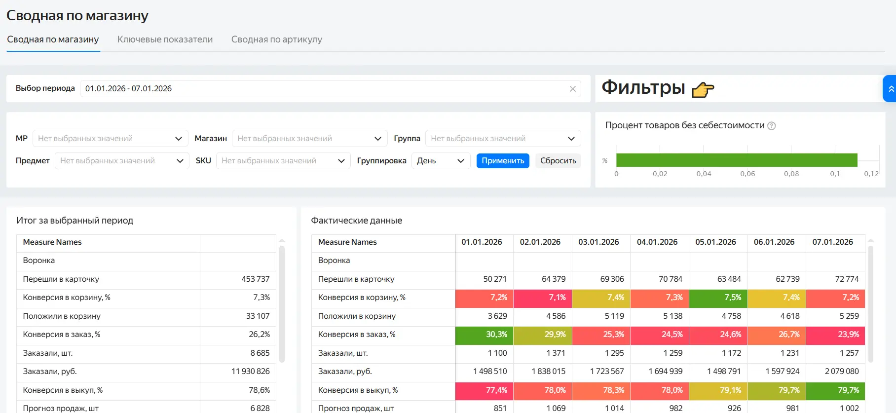 В сводном дашборде селлер видит всю ключевую аналитику по бизнесу: продажи и выручку, воронку (показы, клики, заказы и конверсии), процент выкупа и отмены, цены и скидки, расходы (себестоимость, логистика, комиссии) и итоговую прибыль, а также динамику по дням и прогнозы. Это позволяет сразу понять, сколько бизнес зарабатывает, где теряются деньги и на каком этапе падают продажи.