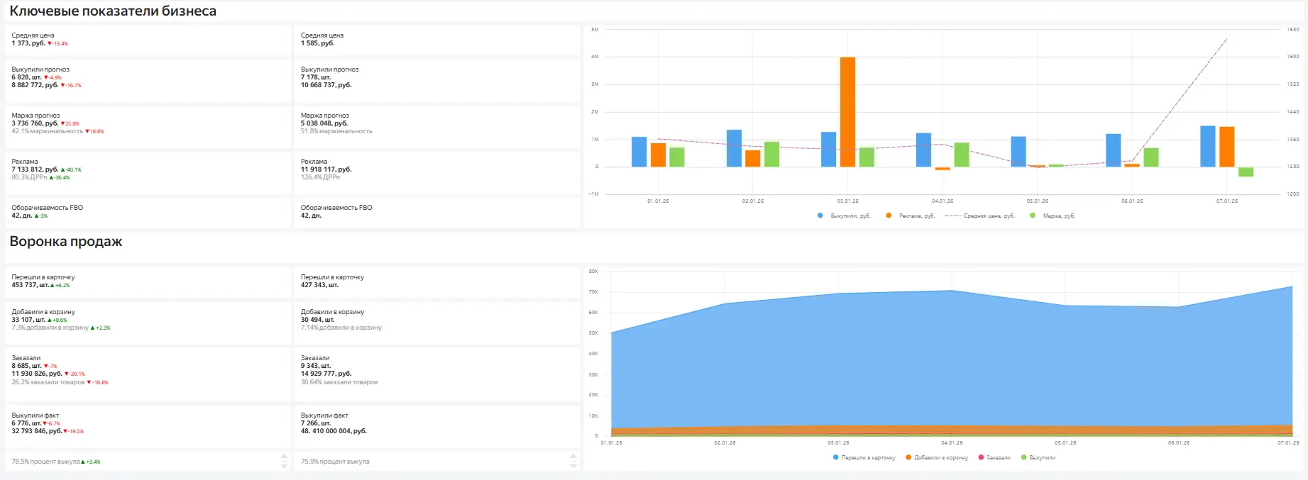 Отдельный дашборд показывает ключевые метрики в динамике: выручку, маржу, рекламу и среднюю цену. По нему быстро видно, где начинается просадка и что именно на нее влияет.
