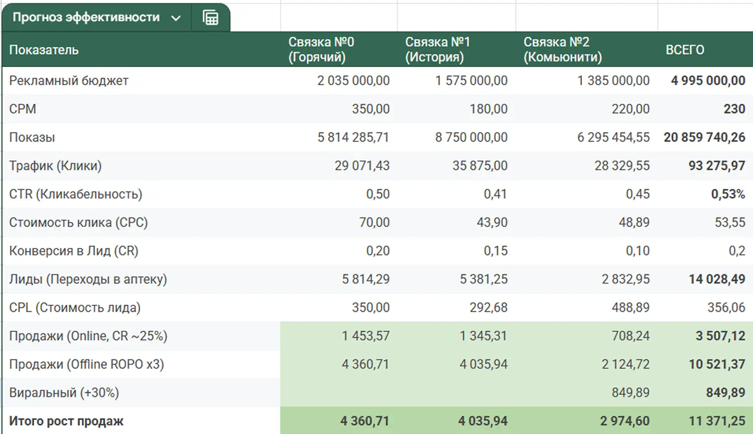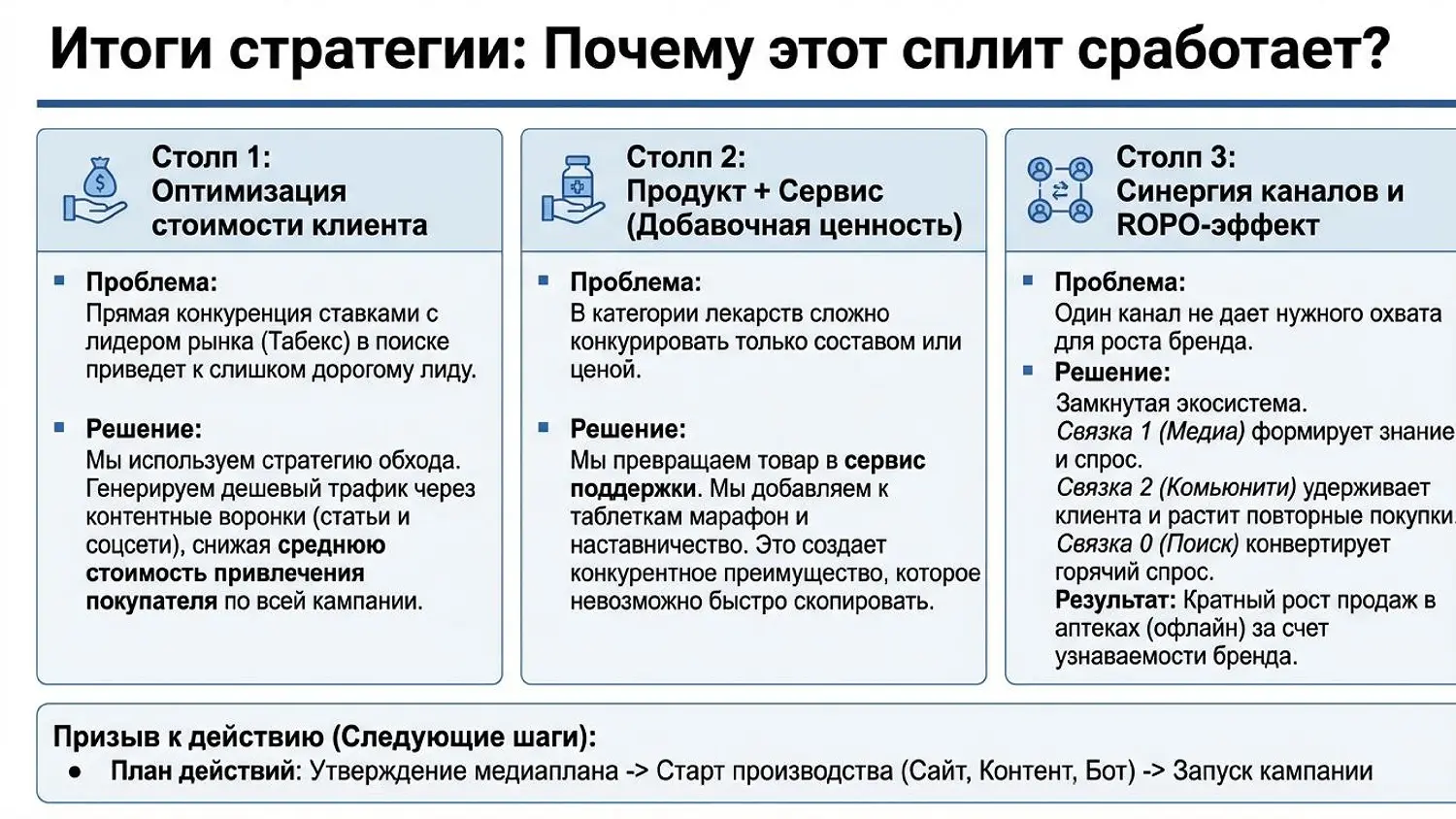 Стратегия включает параллельный мониторинг офлайн-продаж в аптечных сетях — чтобы видеть реальный эффект онлайн-узнаваемости на полочные продажи.