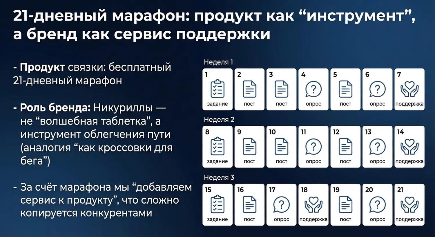 Закрытое сообщество в VK + чат-бот в Senler для проведения 21-дневного марафона поддержки. Продукт становится не таблеткой, а частью системы.