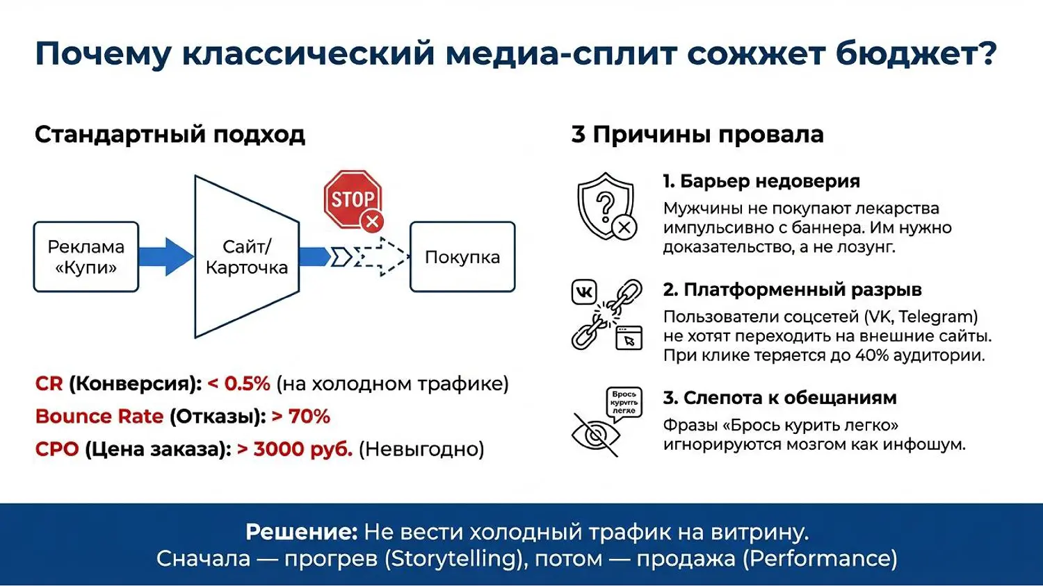 «Главный вызов проекта заключался в барьере недоверия: мужчины не покупают лекарства импульсивно. Мы решили не продавать таблетки «в лоб», а предложили систему поддержки, где препарат стал инструментом достижения цели»