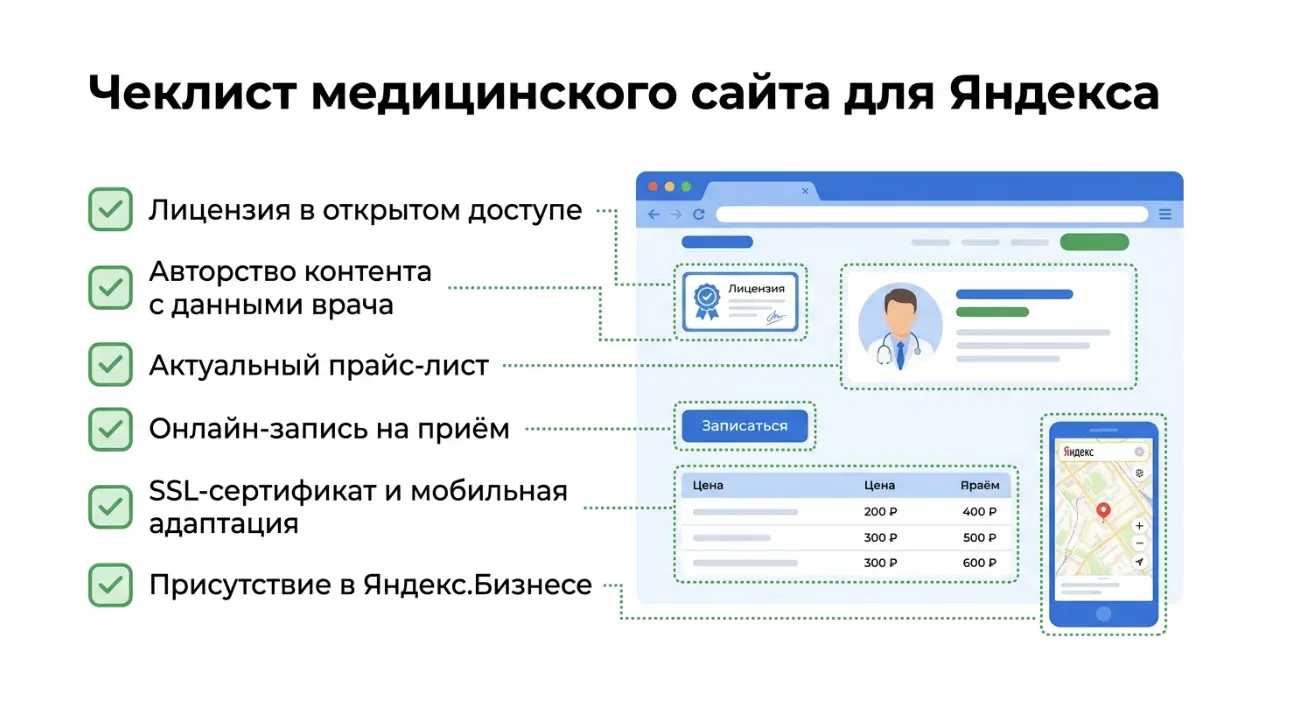 Для клиник и медицинских центров исключительно важны коммерческие сигналы: актуальный прайс-лист с ценами на услуги, онлайн-запись на прием, раздел с отзывами пациентов, подробные страницы о враче и его специализации, разделы «О клинике» и «Вакансии». Яндекс рассматривает все это как подтверждение того, что перед ним — реально работающая организация, а не информационная страничка-однодневка.