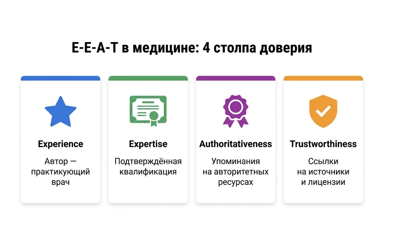 В 2022 году Google расширил концепцию EAT (Expertise, Authoritativeness, Trustworthiness), добавив еще одну букву E — Experience (Опыт). Получилась формула E-E-A-T, которую сегодня применяют как ориентир специалисты по SEO для медицинских сайтов в обеих поисковых системах. Расшифровывается она следующим образом: