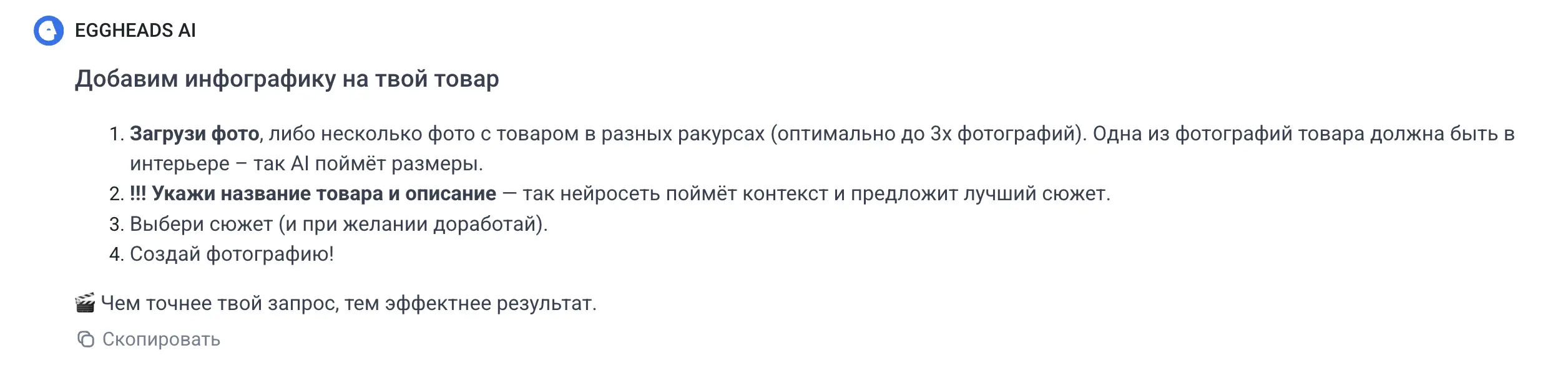 Нашел сайт, где можно через нейросеть генерировать фото и делать инфографику для карточек товара. Называется EGGHEADS.
