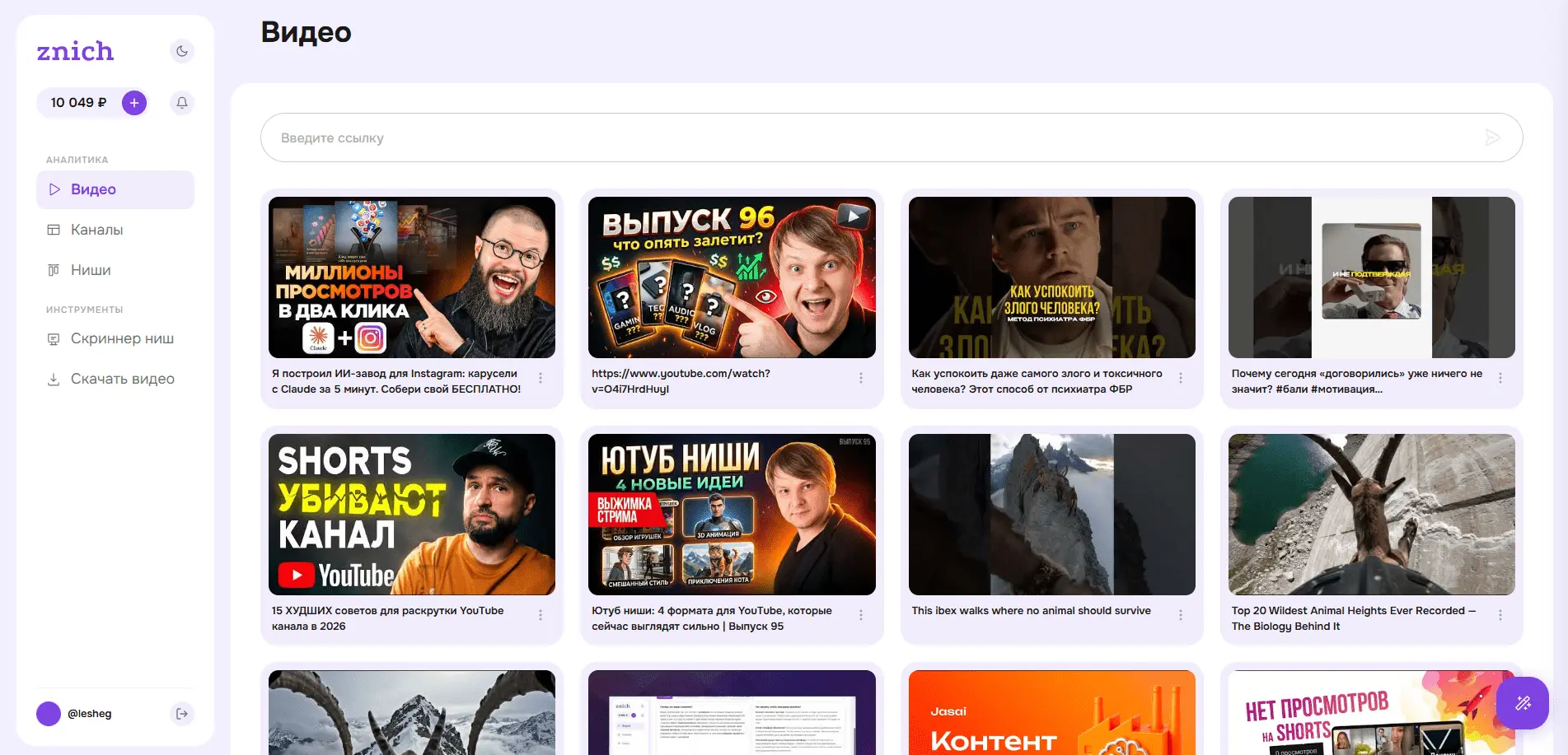 - Вы ведёте русскоязычный YouTube-канал и хотите в одном кабинете разбирать чужие видео, аудитить свой канал и изучать конкурентов. znich.ru. В одном окне собраны анализ отдельного ролика, аудит канала и нишевый разбор.