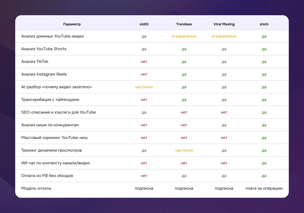 Сильные стороны. Znich закрывает в одном окне то, на что у других сервисов уходит два-три разных подписочных кабинета. Массовый скриннер YouTube-ниш — уникальная функция среди этой четвёрки: за один запуск сервис прогонит до 10 ниш, каждую — скоринг-шаблоном, каждую — саммари от ИИ. ИИ-чат по сущности — тоже своеобразная штука: модель помнит метрики конкретного видео или канала и не требует заново объяснять контекст в каждом новом вопросе.
