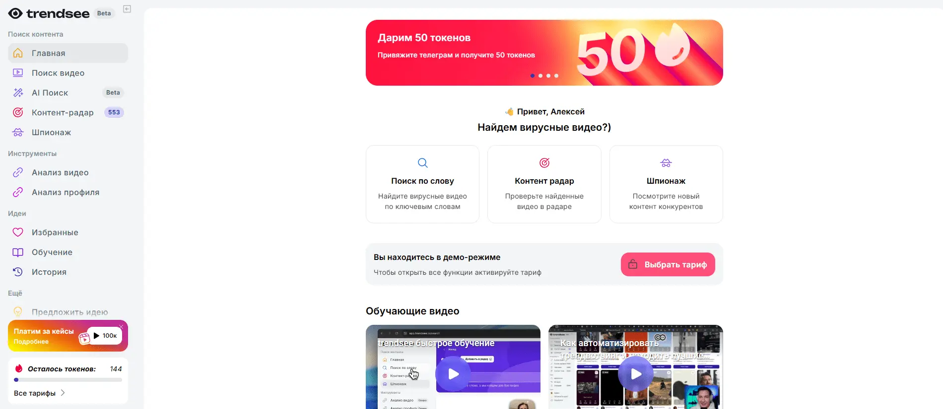 trendsee.io - российский сервис, запущенный в 2025 году. Философия прямо противоположная vidIQ: не SEO и не длинные видео, а вирусные ролики в коротком формате — Instagram Reels, TikTok, YouTube Shorts.
