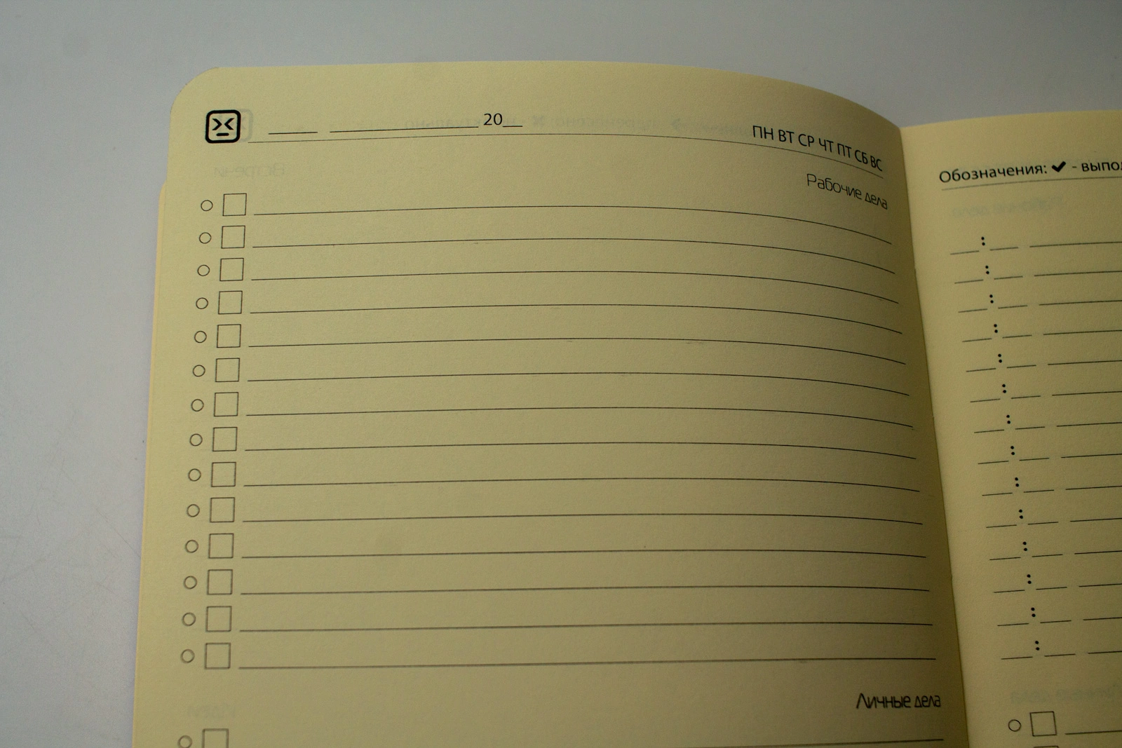 Клиент достаточно долго искал подходящие блоки. Ему нужен был ежедневник, где на одном развороте виден целый день, а задачи четко разделены по категориям. Рабочее, личное, встречи, идеи. Плюс система маркировки - выполнено, перенесено, не актуально. Готовые решения на рынке такое редко предлагают. Пришлось рисовать с нуля.