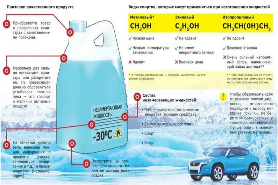 Особенно внимательно стоит отнестись к продукту, если вы видите сразу несколько признаков из списка ниже: очень низкая цена, торговля с рук или на дороге, почти полное отсутствие запаха у зимнего состава, отсутствие точных данных о производителе и составе, кривая этикетка, смазанная печать, ошибки в тексте мутность, хлопья, осадок, расслоение, сомнительные обещания при минимуме информации, отсутствие документов на товар